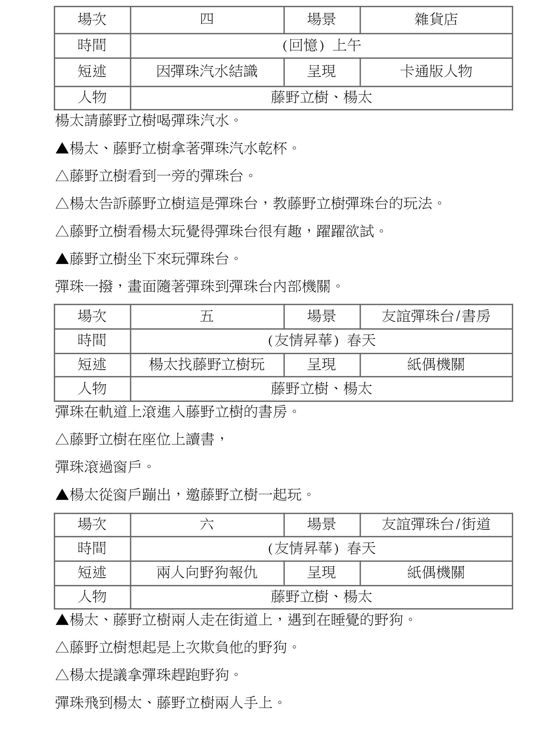 有人按壓彈珠汽水瓶口,彈珠向下而衝,氣泡隨之而上,從雲 層中出現美軍的轟炸機,落下原子彈。故事來到一年前藤野一 家因父親來臺灣工作,從日本搬家到臺灣生活。隔天一早,立 樹走出家門口升上日本國旗,剛升上國旗就被野狗盯上。另一 方面,住在對街的楊太,正在觀察剛新鄰居的一舉一動,觀察 過程中街上的野狗突然襲擊立樹,楊太幫助立樹逃脫險境。身 為剛搬來的立樹對這個街區不太熟悉,楊太得知後決定邀立樹 到他家開的雜貨店,並請立樹喝彈珠汽水。