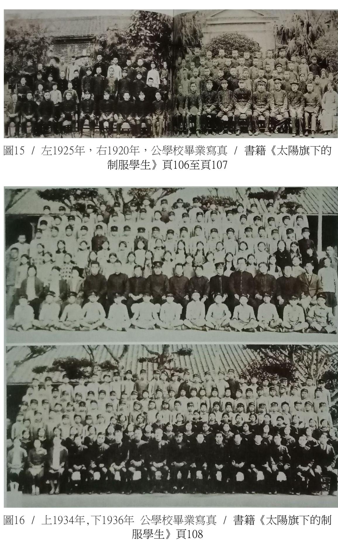 在公學校無論男女都穿著統一的學生制服 男學生是卡其色摺領學生服,女學生是常見的水手服。