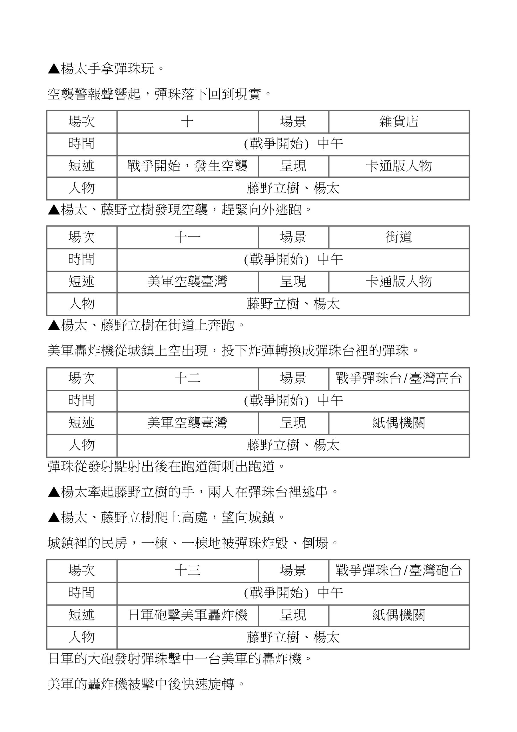 雜貨店外頭響起空襲警報聲,在雜貨店裡頭的楊太與立樹趕緊 逃跑。街道上空出現美軍的轟炸機投下彈藥,彈藥向下衝刺。