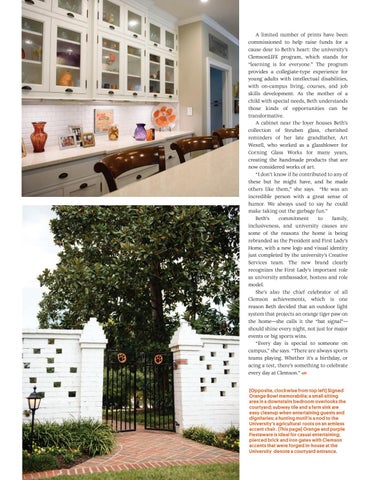 A limited number of prints have been commissioned to help raise funds for a cause dear to Beth’s heart: the university’s ClemsonLIFE program, which stands for “learning is for everyone.” The program provides a collegiate-type experience for young adults with intellectual disabilities, with on-campus living, courses, and job skills development. As the mother of a child with special needs, Beth understands those kinds of opportunities can be transformative. A cabinet near the foyer houses Beth’s collection of Steuben glass, cherished reminders of her late grandfather, Art Wexell, who worked as a glassblower for Corning Glass Works for many years, creating the handmade products that are now considered works of art. “I don’t know if he contributed to any of these but he might have, and he made others like them,” she says. “He was an incredible person with a great sense of humor. We always used to say he could make taking out the garbage fun.” Beth’s commitment to family, inclusiveness, and university causes are some of the reasons the home is being rebranded as the President and First Lady’s Home, with a new logo and visual identity just completed by the university’s Creative Services team. The new brand clearly recognizes the First Lady’s important role as university ambassador, hostess and role model. She’s also the chief celebrator of all Clemson achievements, which is one reason Beth decided that an outdoor light system that projects an orange tiger paw on the home—she calls it the “bat signal”— should shine every night, not just for major events or big sports wins. “Every day is special to someone on campus,” she says. “There are always sports teams playing. Whether it’s a birthday, or acing a test, there’s something to celebrate every day at Clemson.” (Opposite, clockwise from top left) Signed Orange Bowl memorabilia; a small sitting area in a downstairs bedroom overlooks the courtyard; subway tile and a farm sink are easy cleanup when entertaining guests and dignitaries; a hunting motif is a nod to the University’s agricultural roots on an armless accent chair. (This page) Orange and purple Fiestaware is ideal for casual entertaining; pierced brick and iron gates with Clemson accents that were forged in-house at the University denote a courtyard entrance.