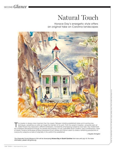 he creation is always more important than the creator. Between imitating established styles and inventing new techniques, sometimes an artist can forget the intention of his work. From his career’s inception, renowned plein air realist Horace Day espoused a different philosophy. Consistently emphasizing substance over style, Day modernized the Charleston Renaissance through his painted documentary of rural, post-WWII South Carolina. Day’s contemporary vision of classic Carolina landscapes employs expressive brush strokes and vibrant colors to create a refreshing perspective on Lowcountry subjects—a taste of originality in the world of the established. —Hayden Arrington The Greenville County Museum of Art will be showcasing Horace Day in South Carolina from now until July 10. For more information, please visit gcma.org.