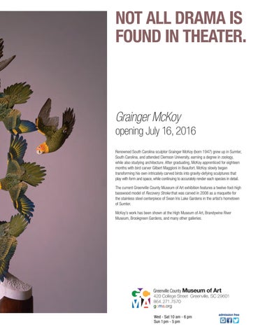 opening July 16, 2016 Renowned South Carolina sculptor Grainger McKoy (born 1947) grew up in Sumter, South Carolina, and attended Clemson University, earning a degree in zoology, while also studying architecture. After graduating, McKoy apprenticed for eighteen months with bird carver Gilbert Maggioni in Beaufort. McKoy slowly began transforming his own intricately carved birds into gravity-defying sculptures that play with form and space, while continuing to accurately render each species in detail. The current Greenville County Museum of Art exhibition features a twelve-foot-high basswood model of Recovery Stroke that was carved in 2008 as a maquette for the stainless steel centerpiece of Swan Iris Lake Gardens in the artist’s hometown of Sumter. McKoy’s work has been shown at the High Museum of Art, Brandywine River Museum, Brookgreen Gardens, and many other galleries.