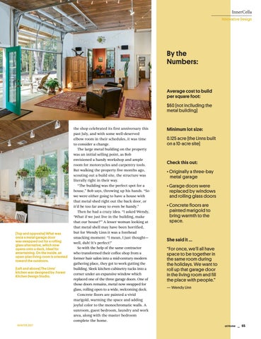 Check this out: • Originally a three-bay metal g arage • Garage doors were replaced by windows and rolling glass doors • Concrete floors are painted marigold to bring warmth to the space.