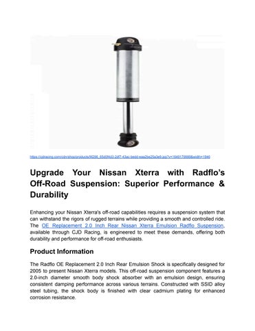CJD Racing is a family-operated racing and fabrication shop specializing in Nissan suspension systems. They offer a wide range of products tailored for models such as the Nissan Titan, Armada, Frontier, Xterra, and Pathfinder. Their inventory includes long travel and standard travel suspension kits, upper and lower control arms, shocks, lighting solutions, and various fabrication components. Notably, CJD Racing provides the only adjustable rear upper control arms available for the Nissan Armada, catering to enthusiasts seeking enhanced performance and customization. The company is also an authorized dealer for Baja Designs, expanding their offerings to include high-quality lighting products. Their website features a user-friendly interface, allowing customers to shop by vehicle type and explore a diverse selection of off-road and performance parts. CJD Racing is committed to delivering quality products designed to meet the demands of off-road enthusiasts and professionals alike.