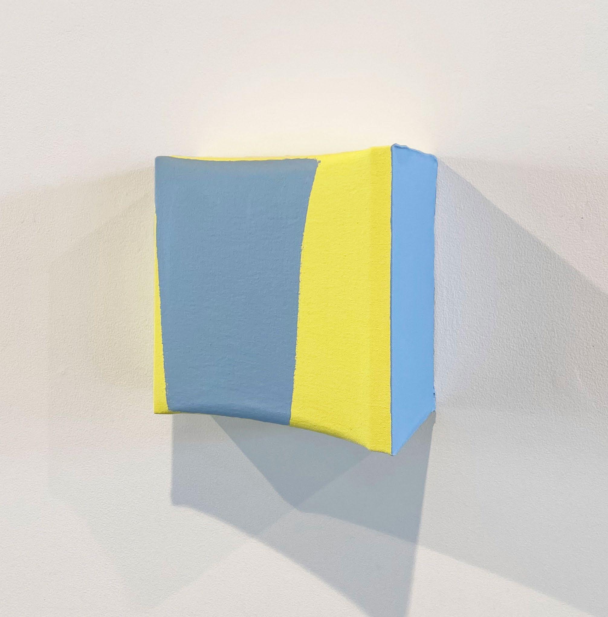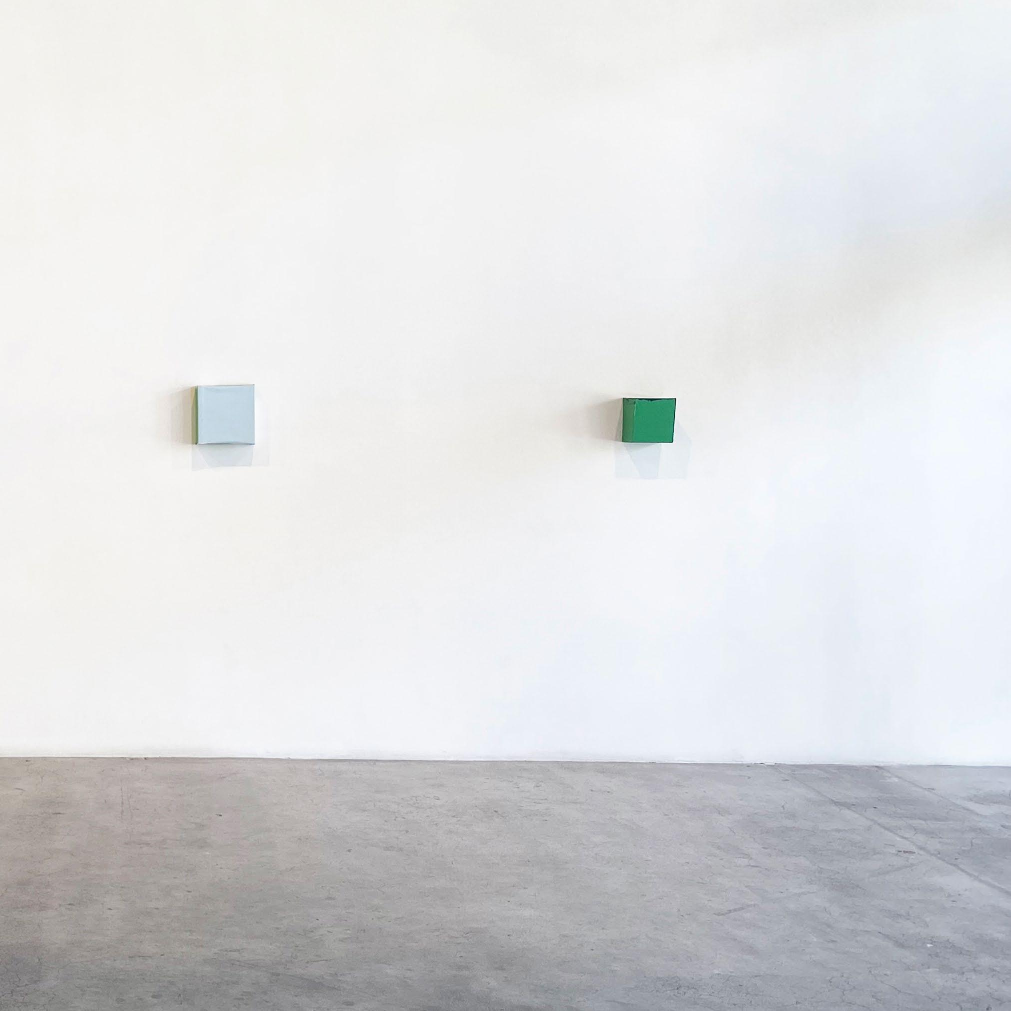 Beech is well-known for his preference for using ordinary and unassuming materials. He started work on the Slent series in 2020. These pieces use canvas stretched over wooden forms, often with a slanted side. That slight difference in the forms causes the eye to refocus and look deeper, while the paint Beech uses accentuates the forms: the cool green and blue of Slent #14, for example, or the way that the thickly applied pale gray of Slent #8 seems to pull the eye toward its edges.