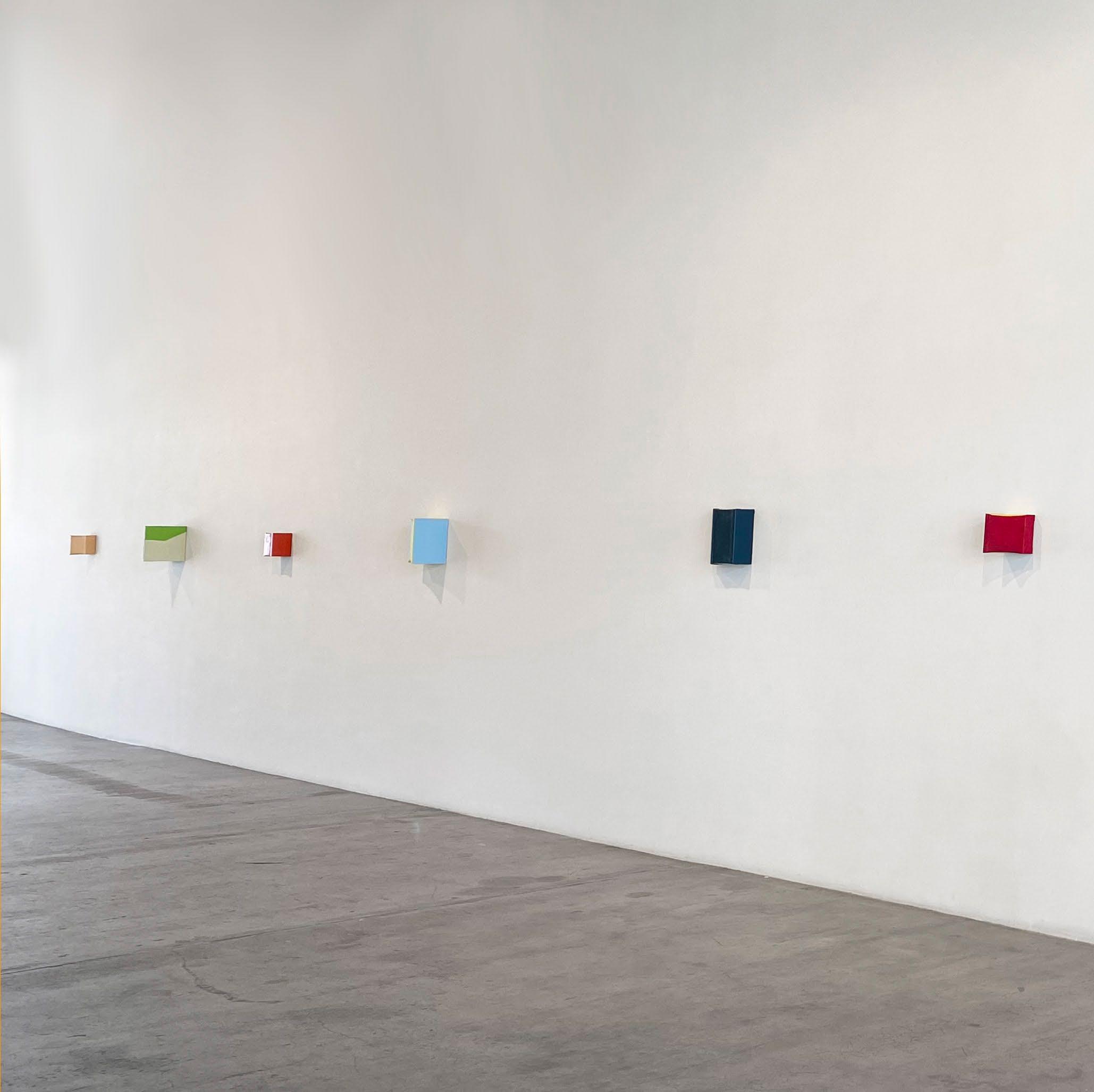 Extraordinary objects. From one wall of the gallery to the other, the viewer walks, pulled by the gravity of each piece. Color draws the eye. A shadowy blue recess within a bright orange construction. A shimmer of dripping gold, fringed with electric blue against a black matte background.