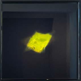 The darkly lit and rippled square wall pieces offer impossible windows which seem to glow from within. Some contain what appear like rips within darkly luminous surfaces which reveal glowing, flickering yellow cores. Another seems to ripple light and shadow in complex waves like water or fire.