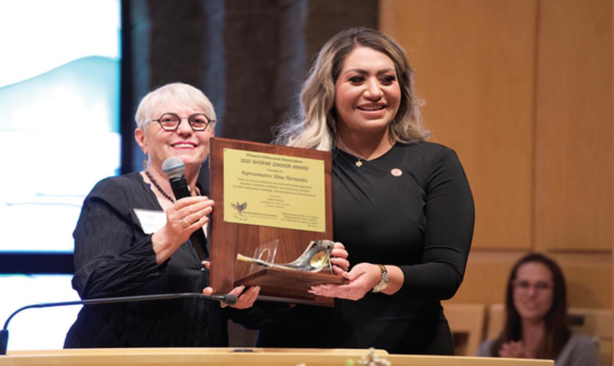 Phoenix Holocaust Association (PHA) President Sheryl Bronkesh (left) is pictured presenting Arizona Rep. Alma Hernandez (right) with a Shofar Zakhor Award, recognizing her service in educating the community about the Holocaust. PHA’s community-wide Yom HaShoah Commemoration 2023 took place at Congregation Beth Israel in Scottsdale on April 16.