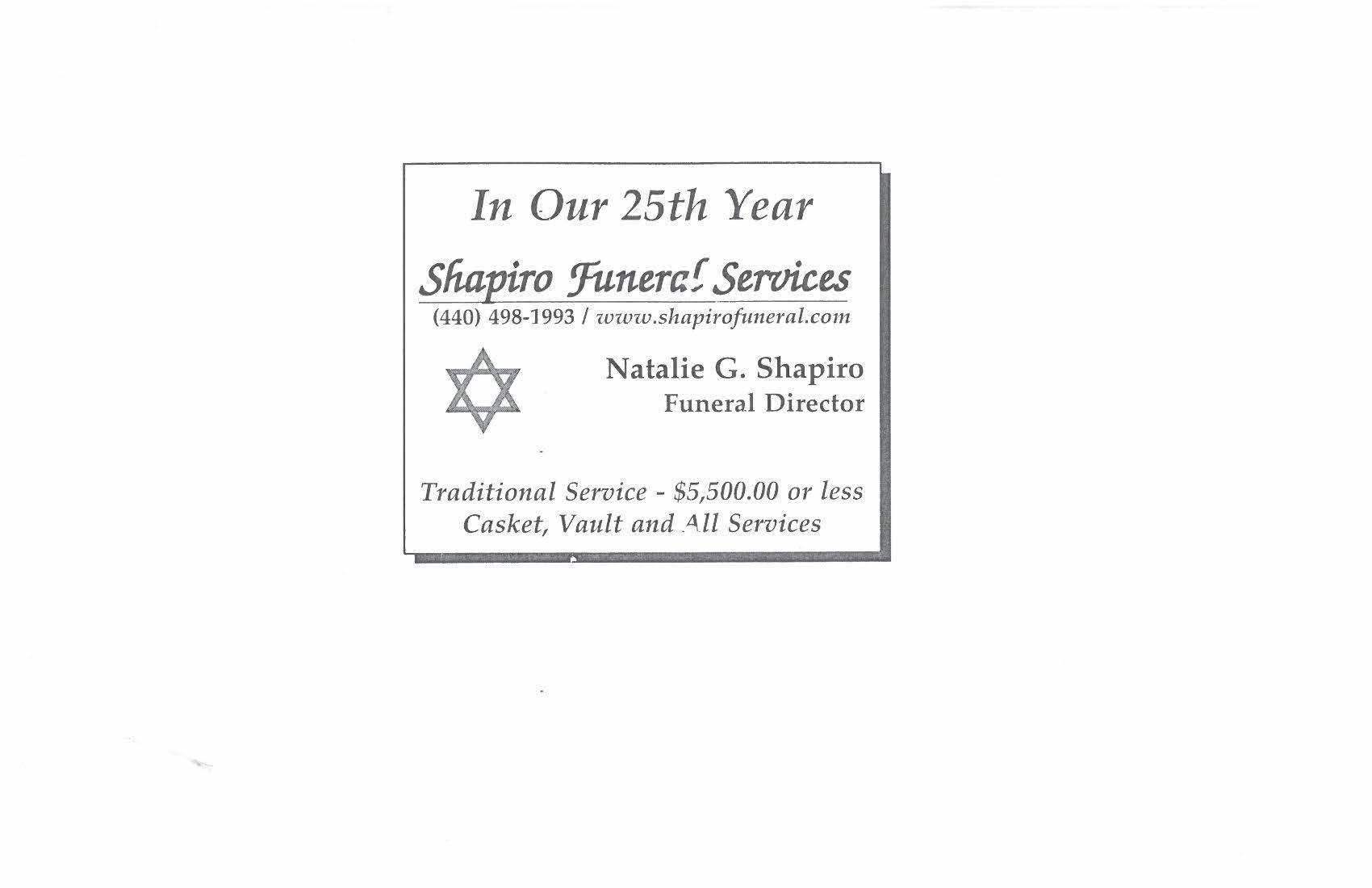 Stan was predeceased by his brother-in-law, Arthur Weitzner of Shaker Heights. In addition to his loving wife of 64 years, Stan is survived by his sons, Scott (Karen) of Weston, Fla. and Michael (Ruth) of Santa Barbara, Calif.; grandchildren, Brielle, Shelbie, Ari and Jared; brothers-inlaw, Robert (Cookie) Weitzner of Beachwood and Ronald (Carolyn) Weitzner of Aurora; and many beloved nieces, nephews and cousins.
