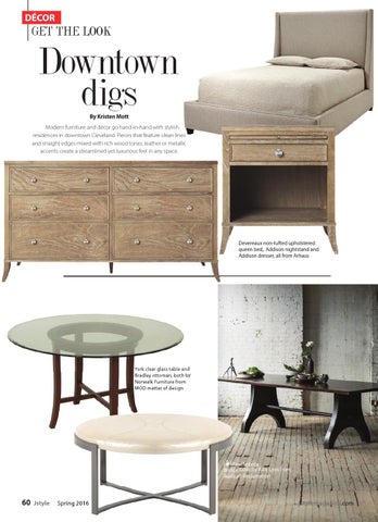 Downtown digs By Kristen Mott Modern furniture and dĂŠcor go hand-in-hand with stylish residences in downtown Cleveland. Pieces that feature clean lines and straight edges mixed with rich wood tones, leather or metallic accents create a streamlined yet luxurious feel in any space.