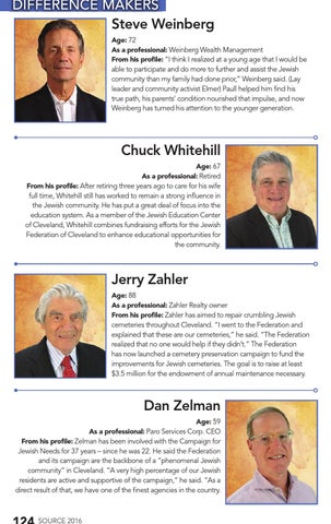 DIFFERENCE MAKERS Steve Weinberg Age: 72 As a professional: Weinberg Wealth Management From his profile: “I think I realized at a young age that I would be able to participate and do more to further and assist the Jewish community than my family had done prior,” Weinberg said. (Lay leader and community activist Elmer) Paull helped him find his true path, his parents’ condition nourished that impulse, and now Weinberg has turned his attention to the younger generation.