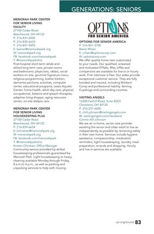 GENERATIONS: SENIORS MENORAH PARK CENTER FOR SENIOR LIVING FACILITY 27100 Cedar Road Beachwood, OH 44122 P: 216-831-6500 P: 216-839-6633 F: 216-831-5492 E: bsilver@menorahpark.org W: menorahpark.org FB: facebook.com/menorahpark T: @menorahparkohio Post-hospital short-term rehab and skilled long-term care; private rooms and bathrooms; physicians, rabbis, social workers on site; gourmet Signature menu; religious programming; kosher kitchen; dementia pavilions; activities, computer center, educational programs; Lewis Aquatic Center; home health, adult day care; physical, occupational, balance and speech therapies; adaptive living shoppe; aging resources center; on-site dialysis care. MENORAH PARK CENTER FOR SENIOR LIVING HOUSEKEEPING PLUS 27100 Cedar Road Beachwood, OH 44122 P: 216-839-6634 E: kchristian@menorahpark.org W: menorahpark.org FB: facebook.com/menorahpark T: @menorahparkohio Kristen Christian, Office Manager Community service provided by skilled housekeeping professionals guaranteed by Menorah Park. Light housekeeping or heavy cleaning available Monday through Friday, 8 a.m.to 4 p.m., as well as packing and unpacking services to help with moving.