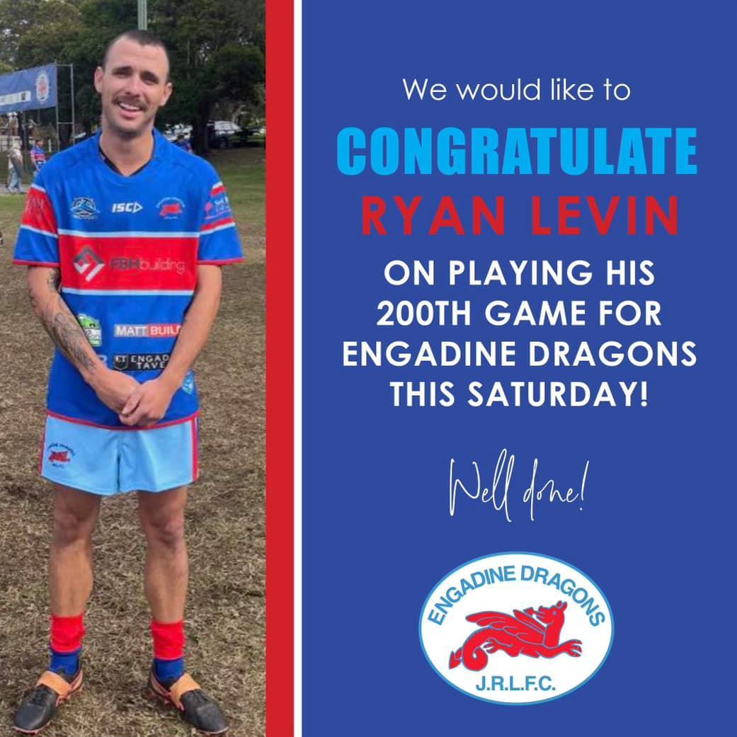 Congratulations to Ryan Levin on a magnificent achievement of 200 games for Engadine Dragons in Saturdays Power Waste Management Cup clash againts De La Salle.