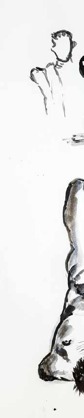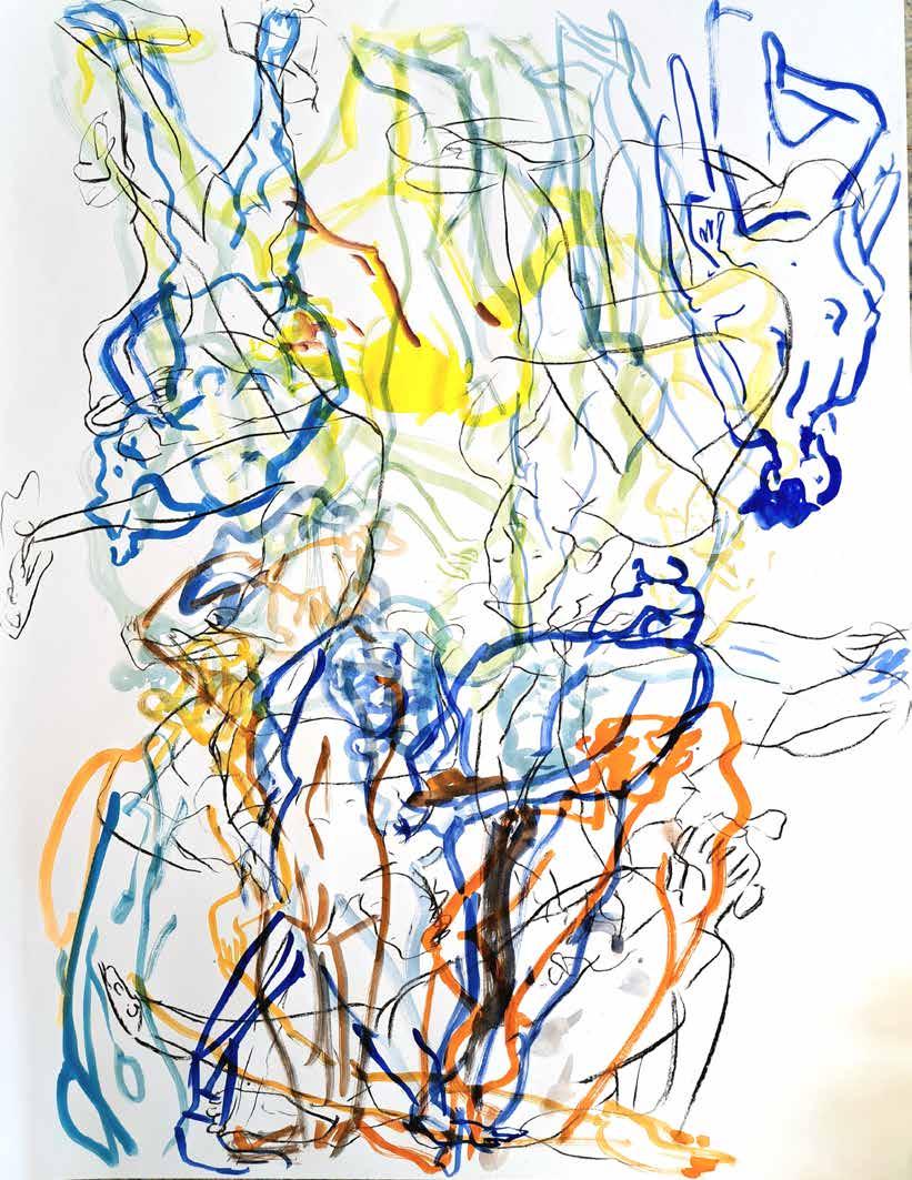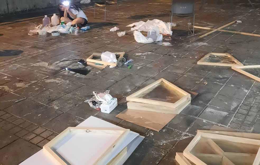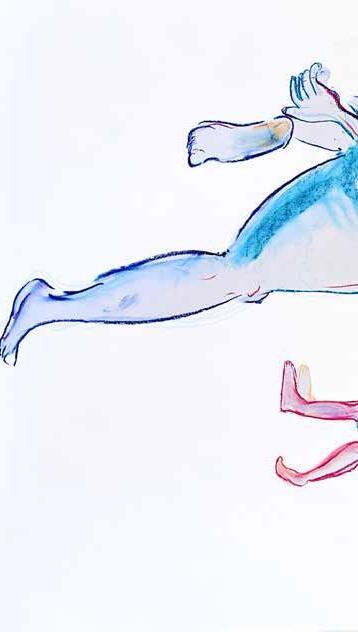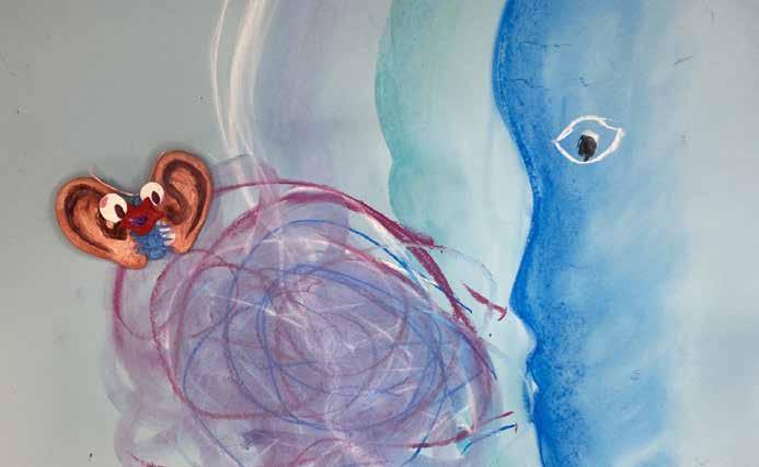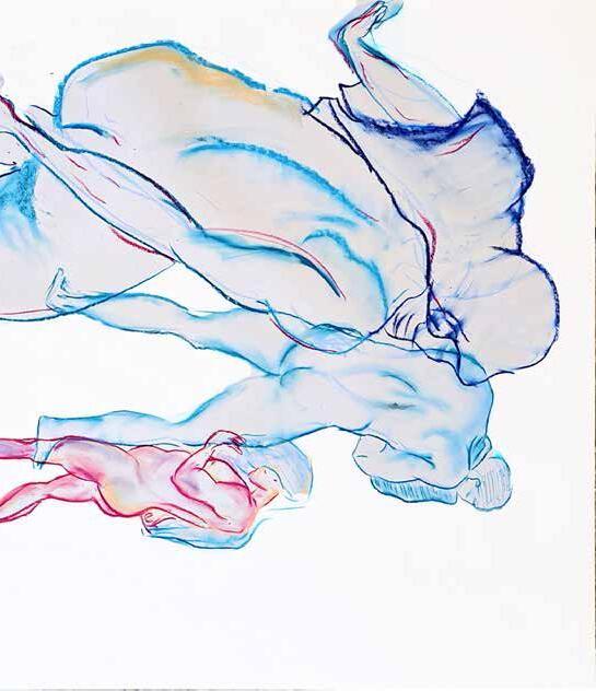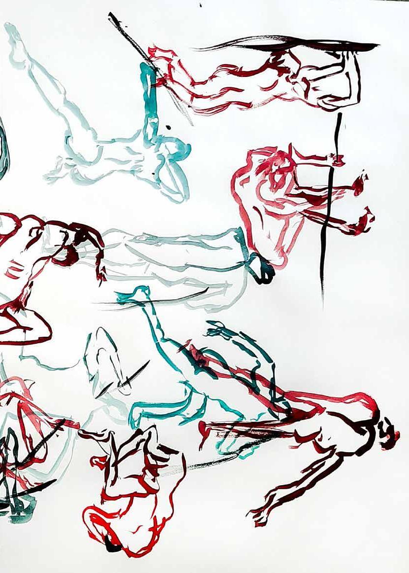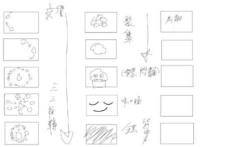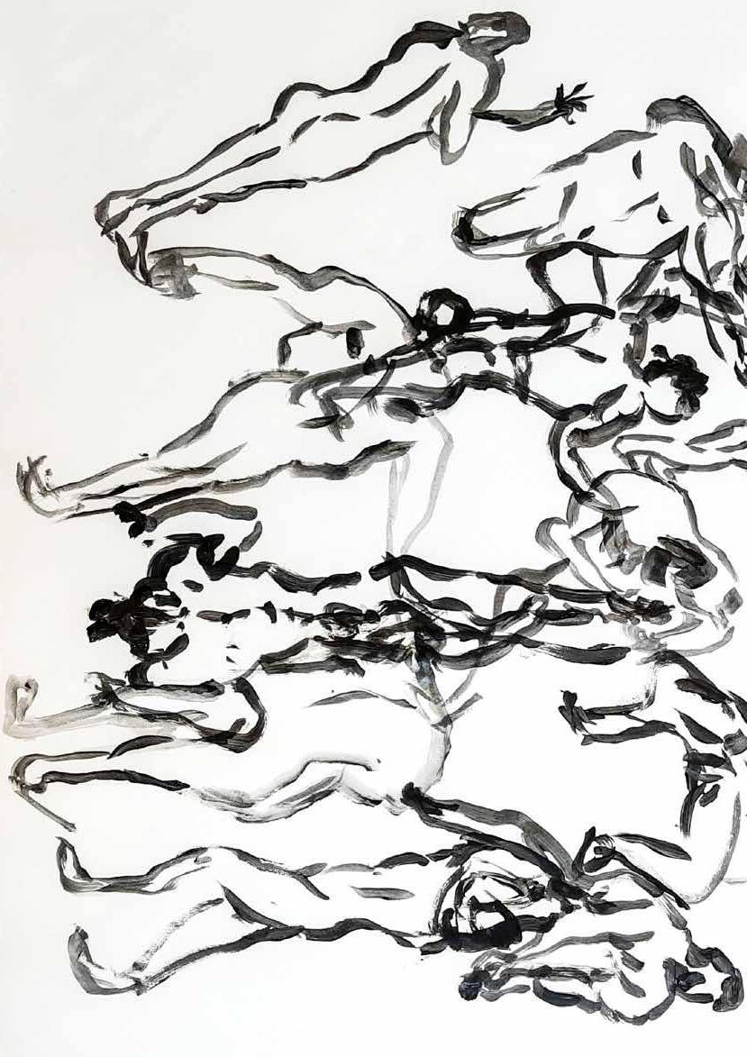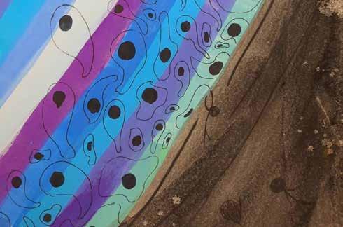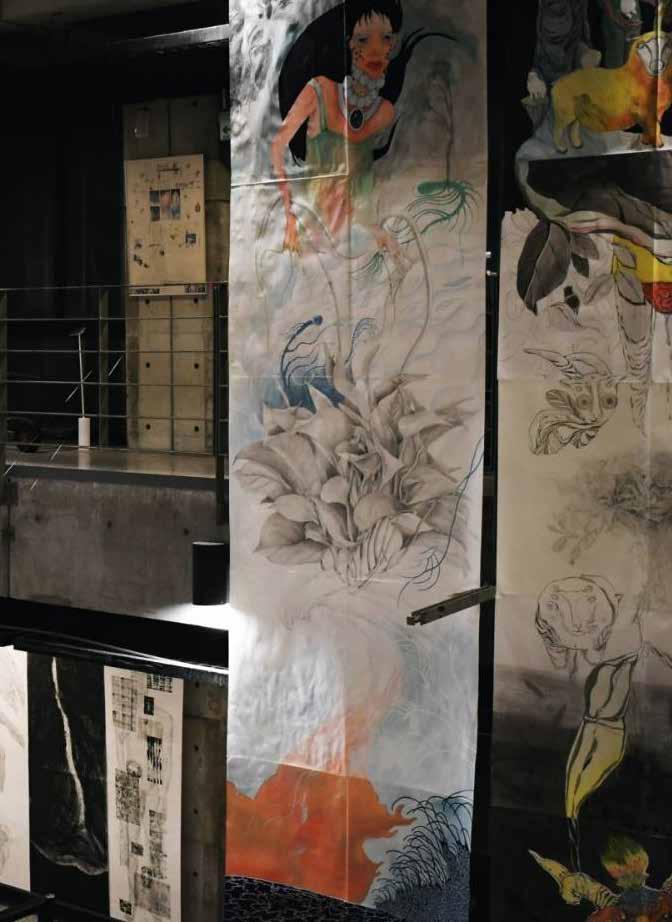 每一次下筆後就急忙想抹開,線條跟我的思緒一樣很不肯定,直到進入心流的狀態,不 再多想外界和自己的質疑,放心的畫、盡情的畫,趴在地上畫好幾個小時也不覺得累, 原來是心裡放鬆了。