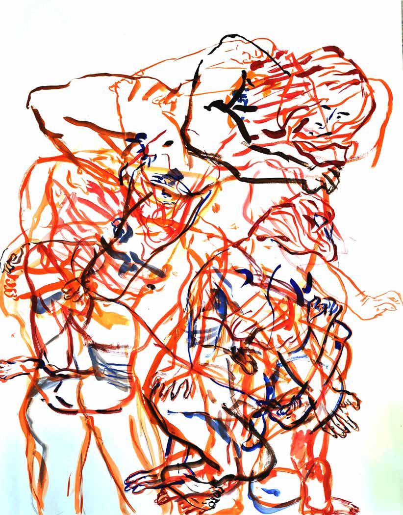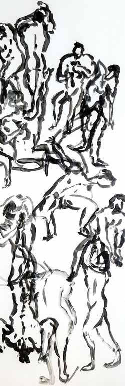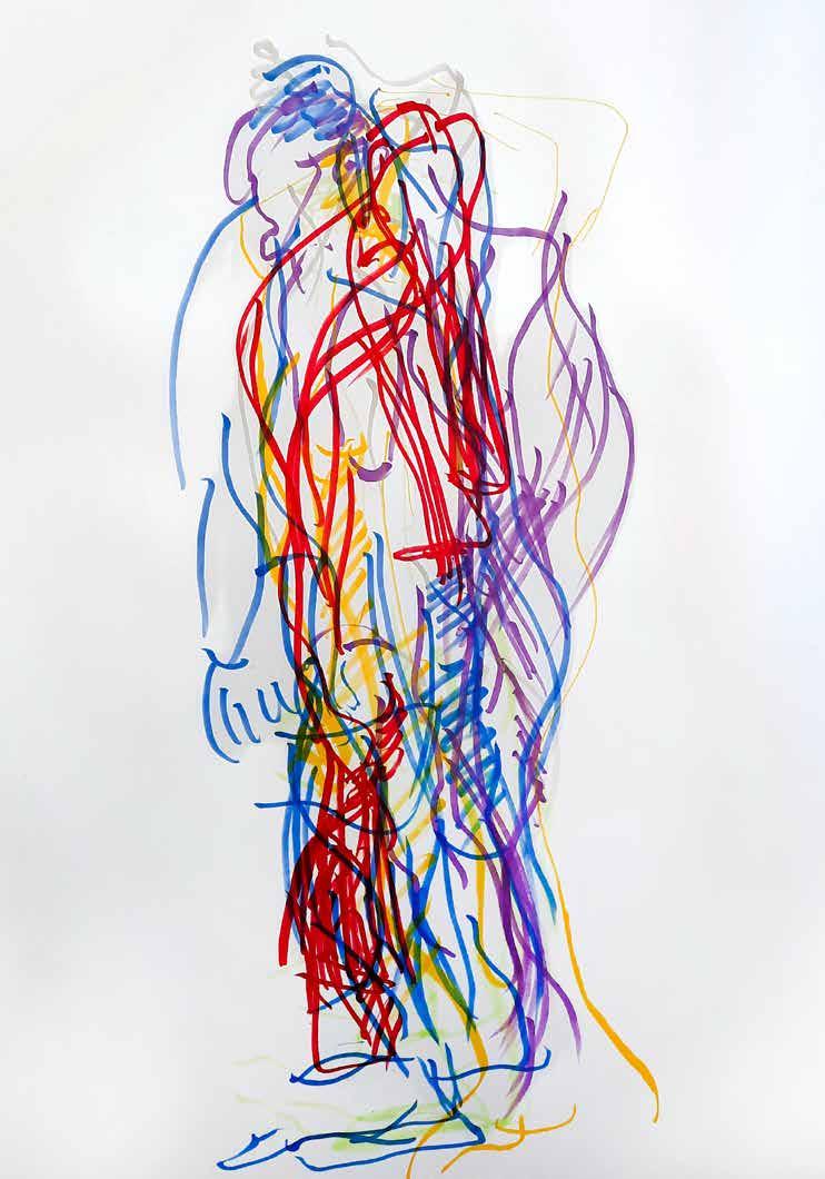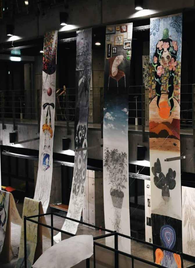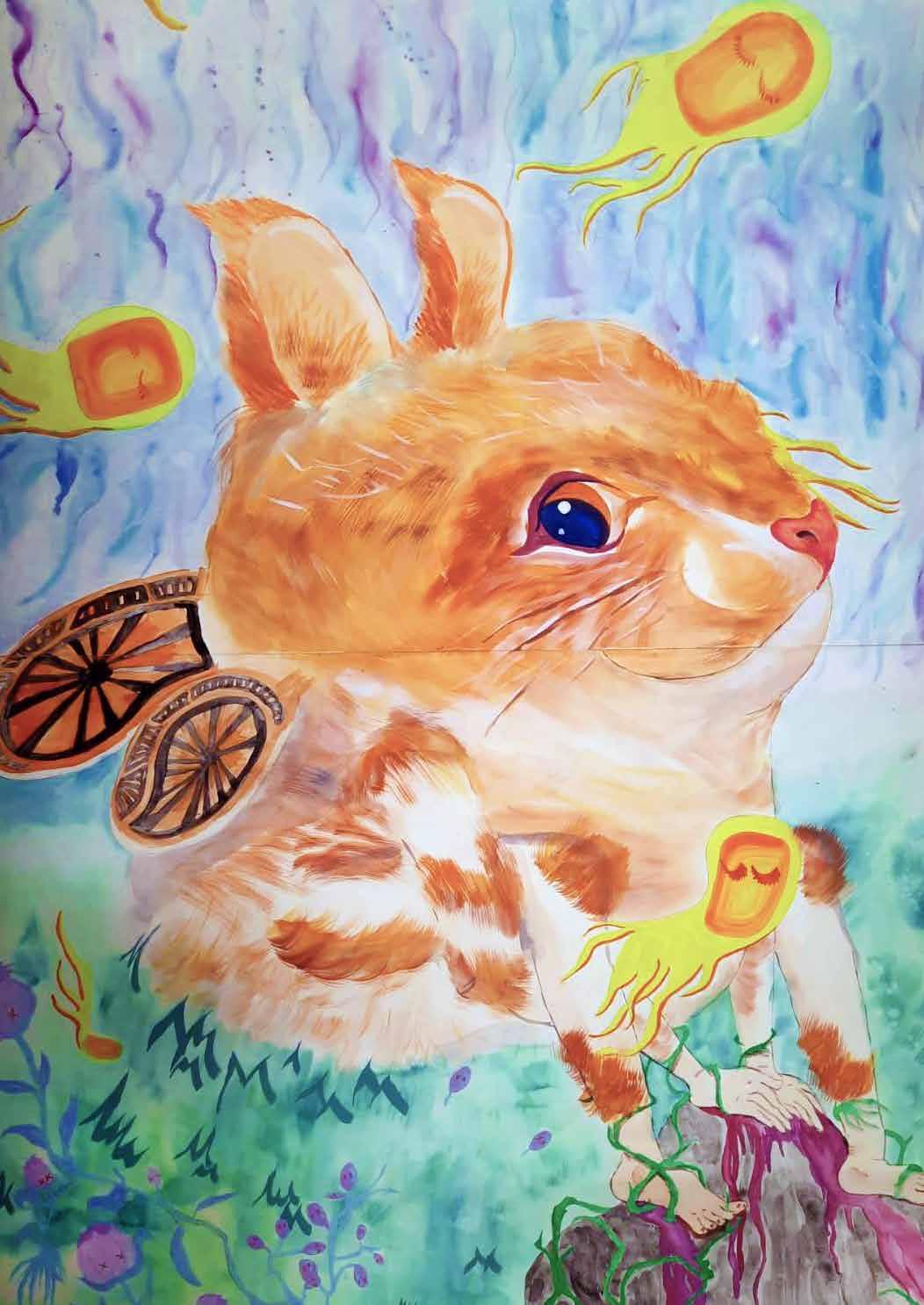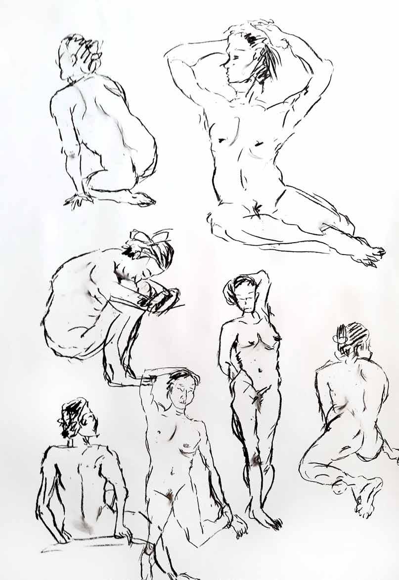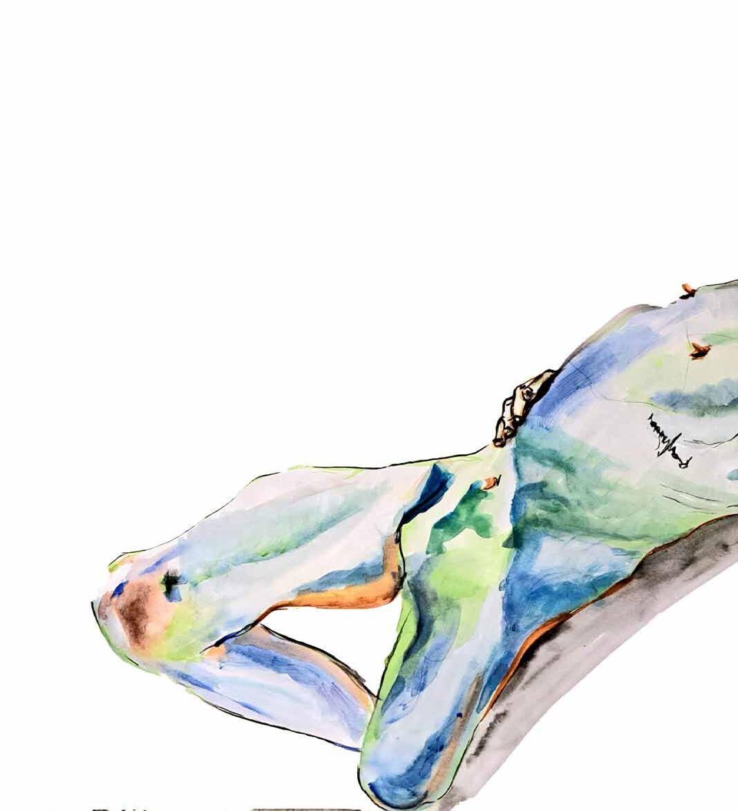 每一次下筆後就急忙想抹開,線條跟我的思緒一樣很不肯定,直到進入心流的狀態,不 再多想外界和自己的質疑,放心的畫、盡情的畫,趴在地上畫好幾個小時也不覺得累, 原來是心裡放鬆了。