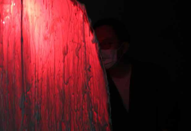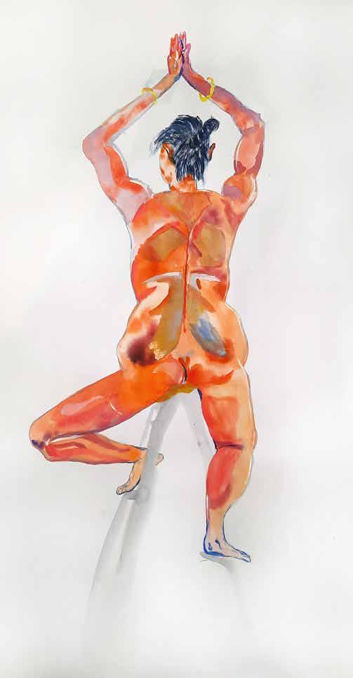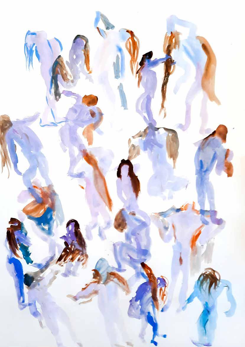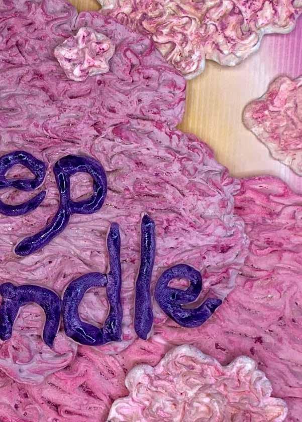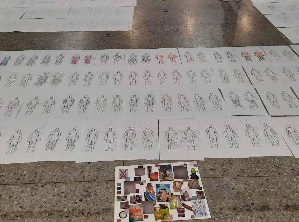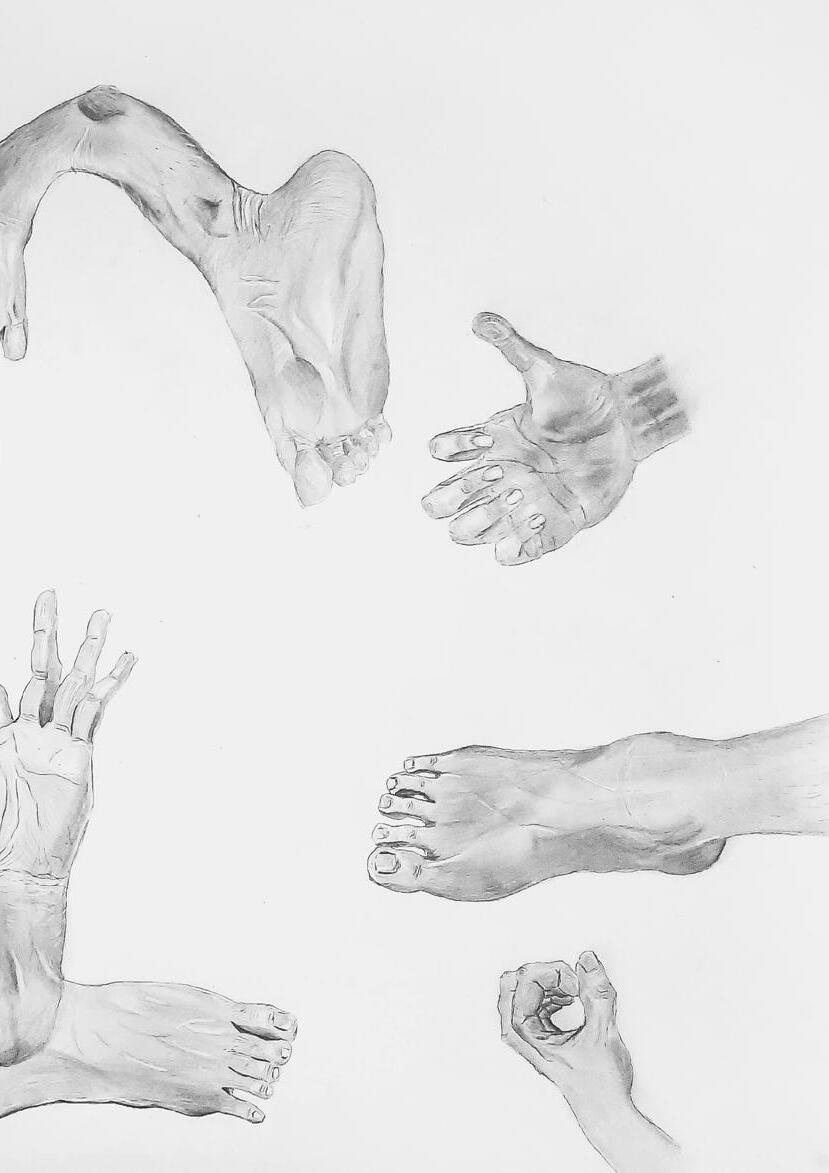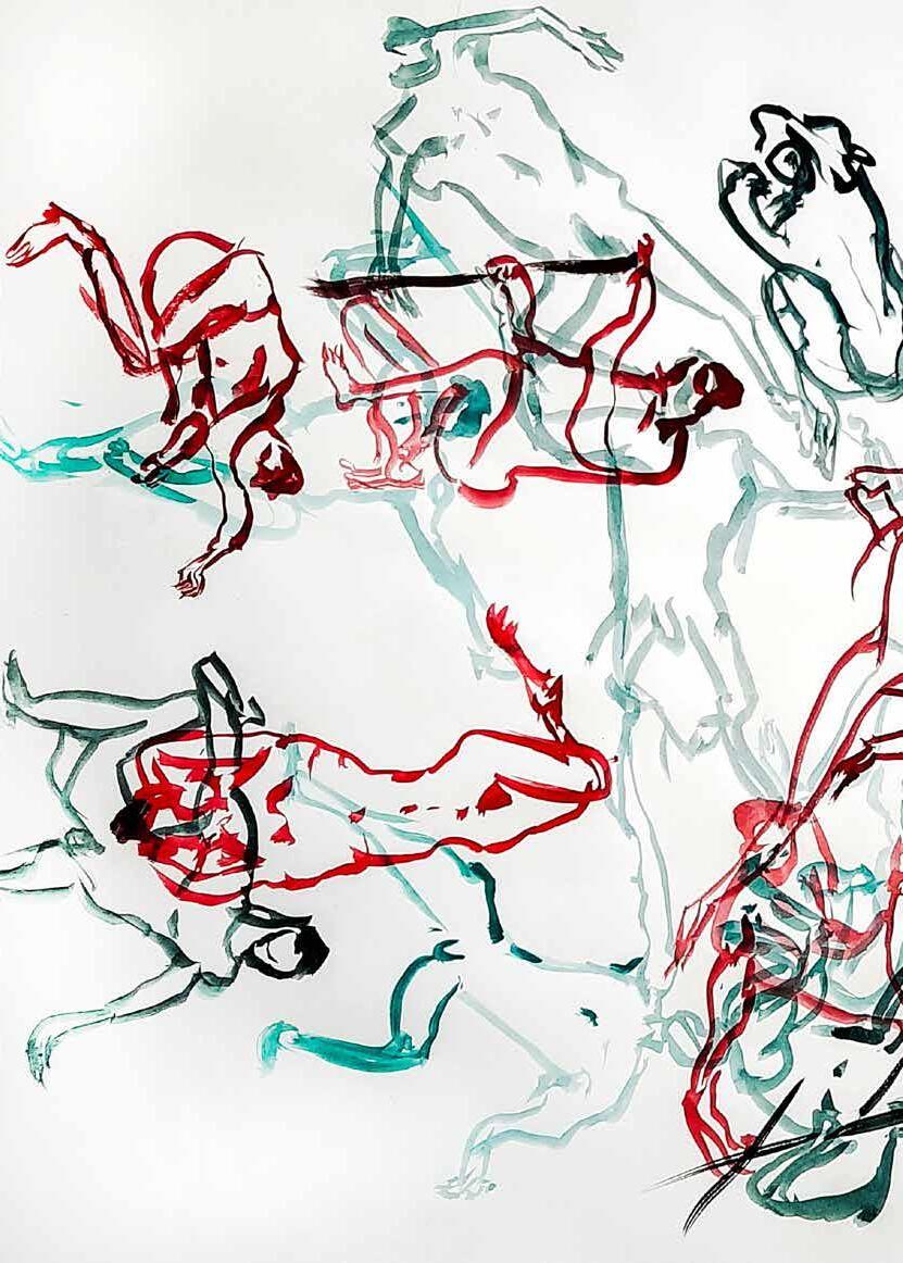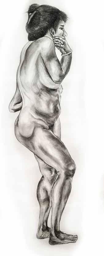 每一次下筆後就急忙想抹開,線條跟我的思緒一樣很不肯定,直到進入心流的狀態,不 再多想外界和自己的質疑,放心的畫、盡情的畫,趴在地上畫好幾個小時也不覺得累, 原來是心裡放鬆了。
