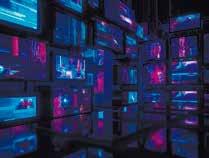 Many screens with turned-on televisions display static noise., , cyberpunk style, blue light, Octane render, �k high detail rendering, photoreal, semi-mechanized, first-person view, Detail Shot, high detail �k--v � --q � --ar �:�