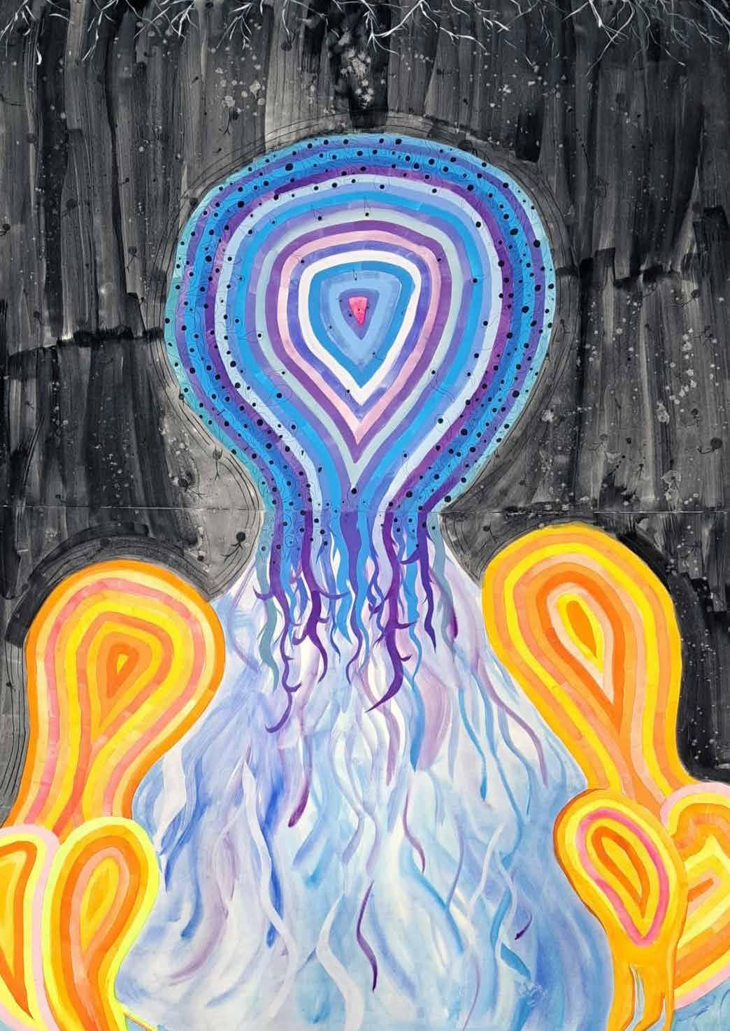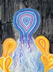 閉上眼睛去感受自己的情緒時,突然冒出有點像內在小孩的發光形體,內部會流動, 依靠負面能量在黑暗中穿梭,同時看到無數個自願沉淪的自己。