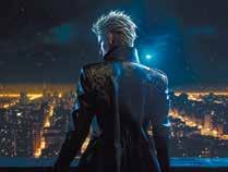 one Cyberpunk prince Standing on the rooftop, overlooking the small town. Golden hair, black suit, extravagant ,rooftop, sci-fi style, cyberpunk style, cyberpunk city, more detail background, cyberpunk style ,high detail background, blue light, floating dust, Octane render, �k high detail rendering, photoreal, semi-mechanized, overlooking, Detail Shot, high detail �k--v � --q � --ar �:�