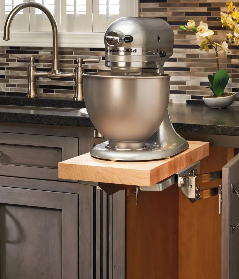 NEVER LIFT YOUR MIXER AGAIN Our heavy duty mixer lift easily raises the mixer out of your cabinet, locks in place and smoothly lowers it with the included soft-close mechanism.