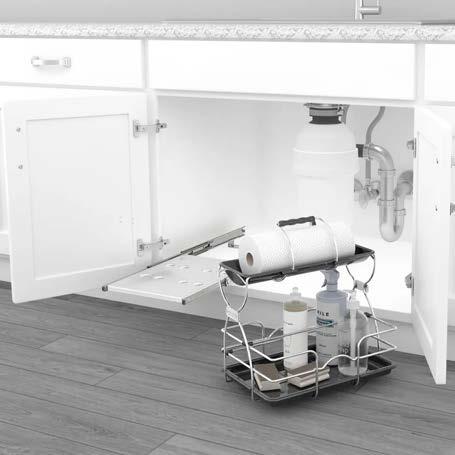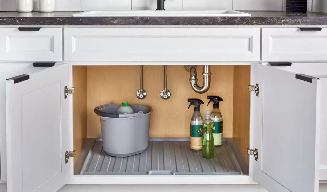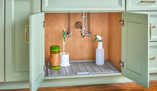 Don’t let water leaks damage the floor of your sink base cabinet. A flexible under-sink tray will not only proect the bottom of your cabinet but funnel water onto the floor in front of the cabinet, alerting you to the leak