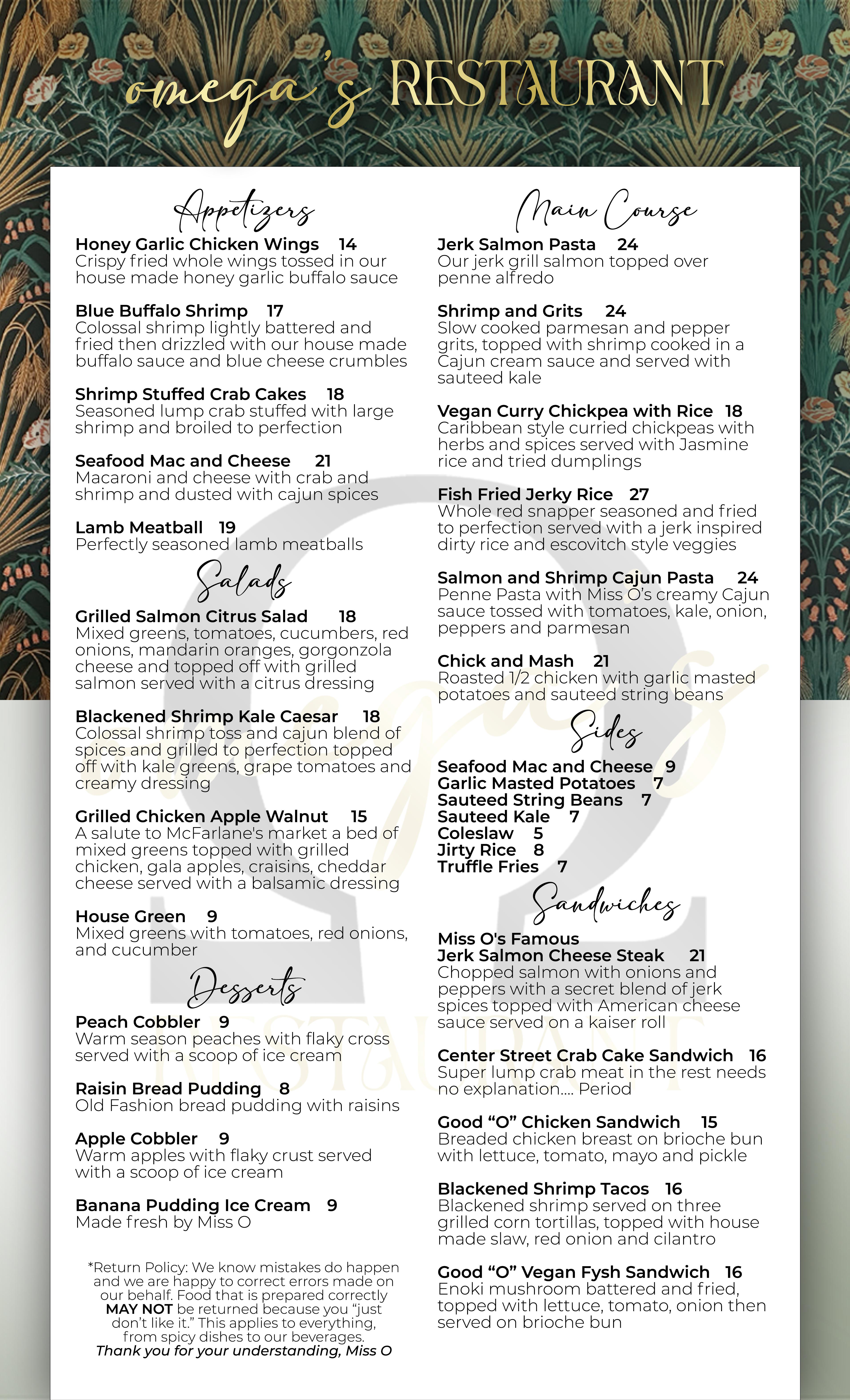 Omegas Restaurant Menu