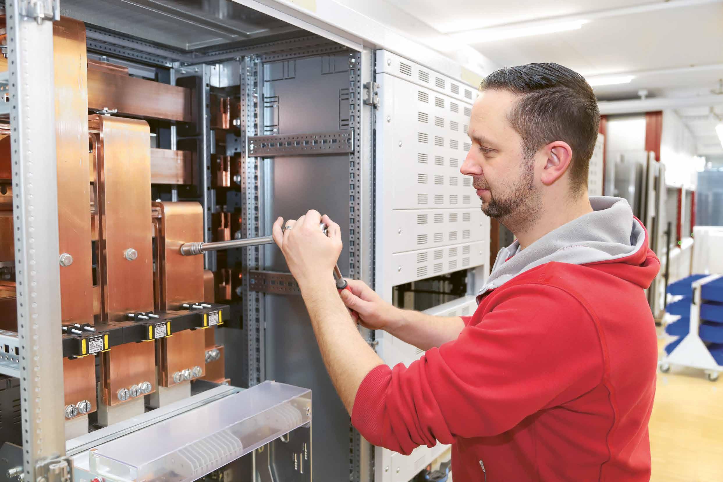 Das Team Rot arbeitet bei der Montage von Schaltanlagen und Steuerungen teilweise unter sehr engen Platzverhältnissen: «Da muss man sich bestens verstehen, sonst kann man nicht Hintern an Hintern arbeiten», meint Matthias Appert, Leiter Fertigung. Seine Augen funkeln, wenn er von den Erlebnissen auf Montage erzählt.
