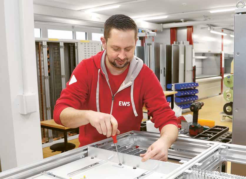 Der Schaltanlagen- und Steuerungsbau ist ein wachsender Teilbereich innerhalb der Gebäudetechnik von EWS. Das Team umfasst zurzeit 15 Mitarbeitende, Tendenz steigend. Matthias schätzt die Abwechslung am Arbeitsplatz. Wir erstellen die Schaltanlagen von der Produktion der einzelnen Teile bis zur Fixierung der letzten Schraube allein oder im Team. «Mitbewerber ermöglichen ihren Mitarbeitenden teilweise nur, einzelne Arbeitsschritte auszuführen. Das ist bei uns anders. Wir haben ein bestausgebildetes Team, dem wir Verantwortung übergeben und Vertrauen schenken», sagt Matthias und lächelt seinen Kolleginnen und Kollegen zu, die gerade einen fertig konfektionierten Stahlblechschrank mit dem Kran zum Transport bereitstellen.