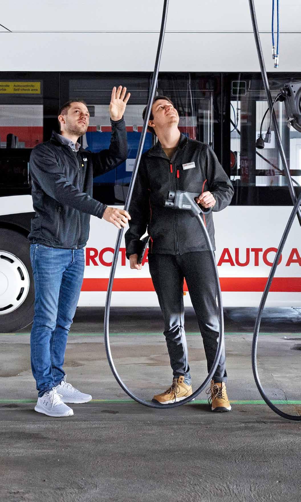 Gion-Luca Dobmann (r.) von der Rottal Auto AG hat mit CKW-Projektleiter Cedric Bühlmann ein innovatives Ladesystem für die neuen Elektrobusse umgesetzt.