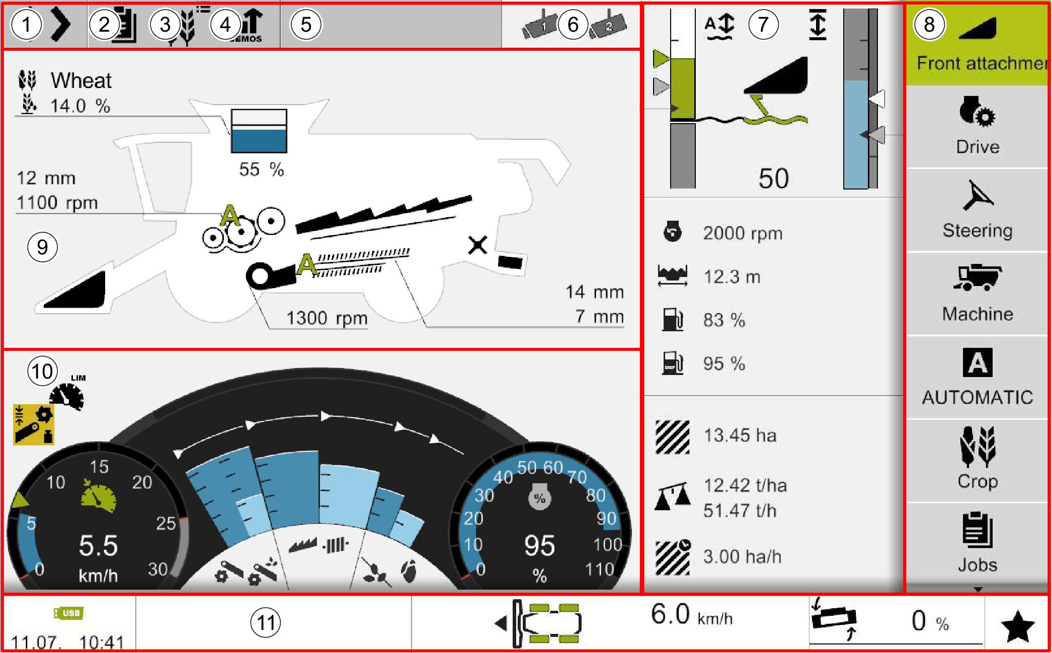 Tips: Learn the working position of the cutterbar in the front attachment menu.