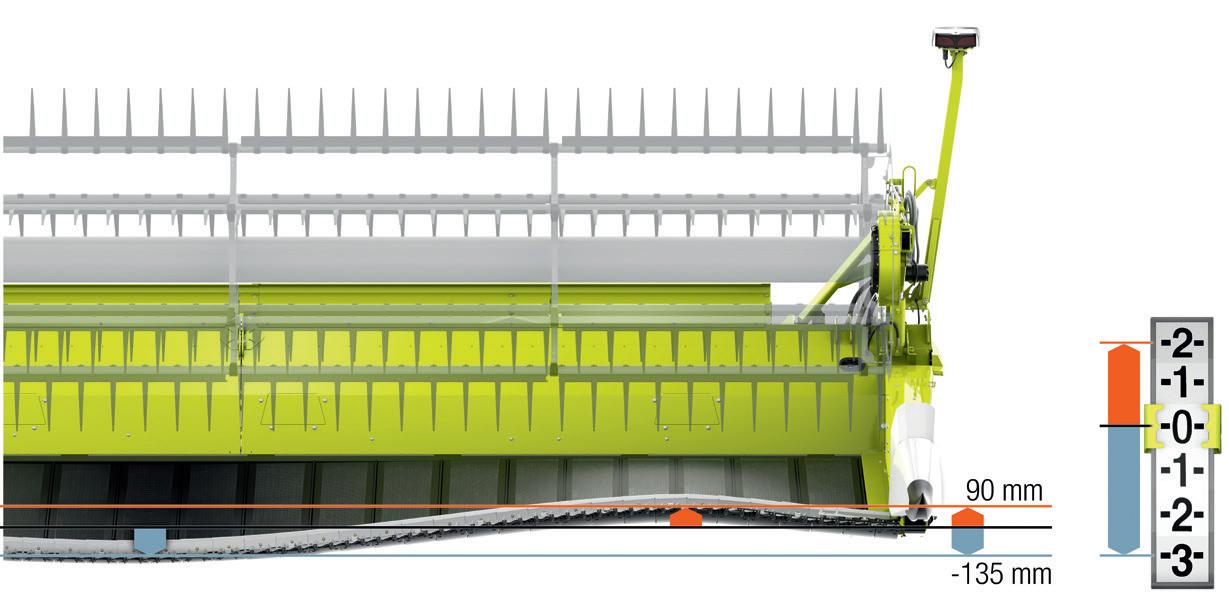 Full Flex with fully adjusting AUTO CONTOUR, Cutterbar is moving both knife and feederhouse, AUTO FLEX try’s to always cut at the lowest possible ground point, best for short crops.