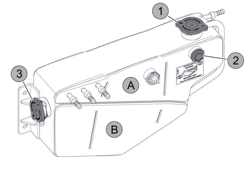 Let the diesel engine and the coolant cool down. The expansion tank is sufficiently filled when the cooling liquid reaches up to the bottom edge of the filler neck. Sight glass (2) on the expansion tank is now completely filled.