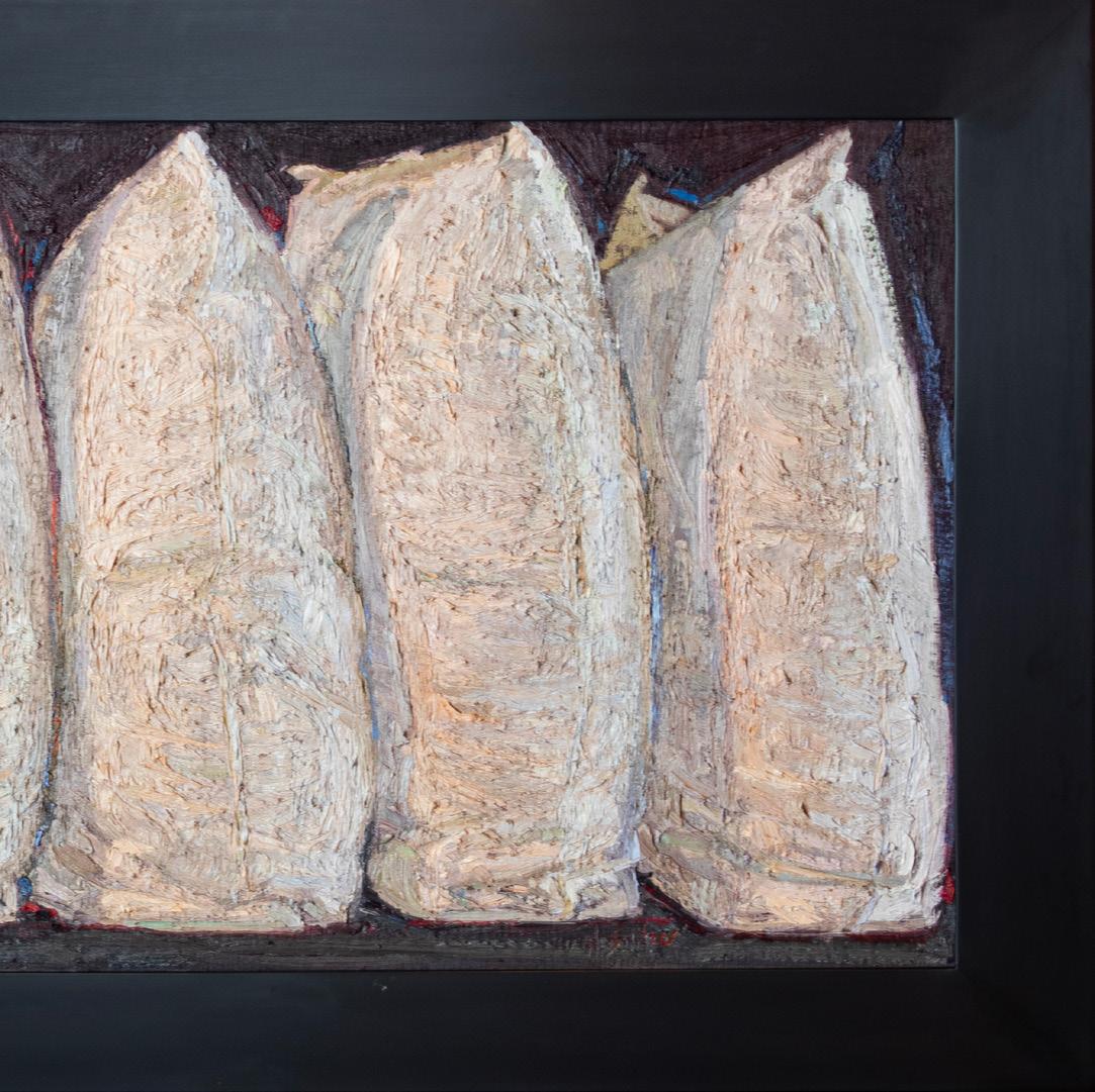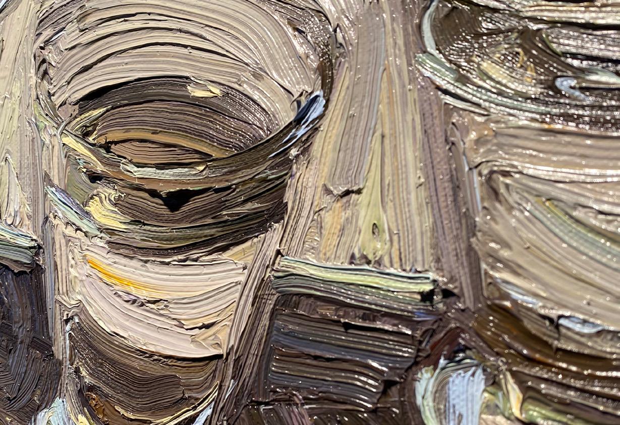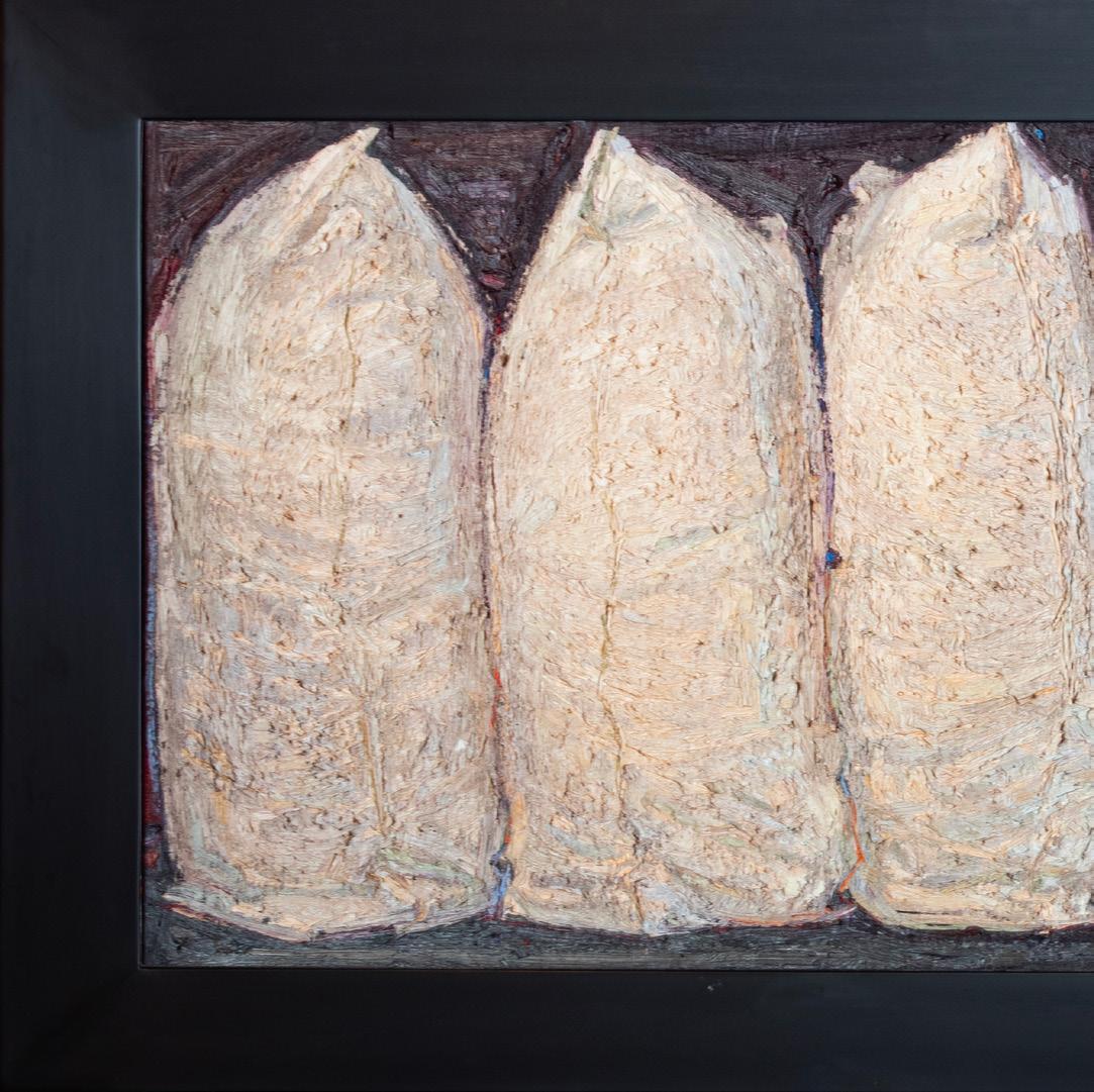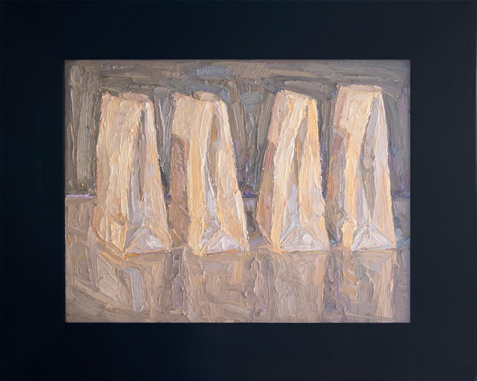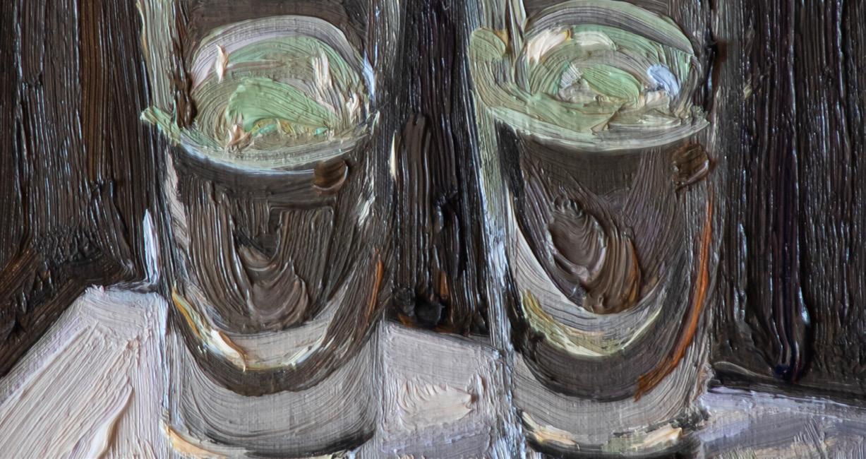 From Denver, Colorado, Nancy Switzer paints still lifes of simple, everyday objects such as milk cartons, water glasses, cans, and more. She is known for her textural, heavy application of paint. An eye for complexity in simple subjects is key to Switzer’s work, saying of cans “A can is a simple shape. It reflects everything around it, takes form and is defined by reflecting what it is not. The can is only visible because of what it reflects. Looking at a can for a time, one begins to see what is-not-there.”