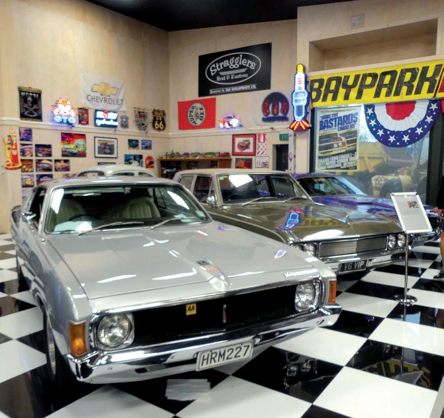 Set among the shining vehicles are old fuel pumps and photos, along with