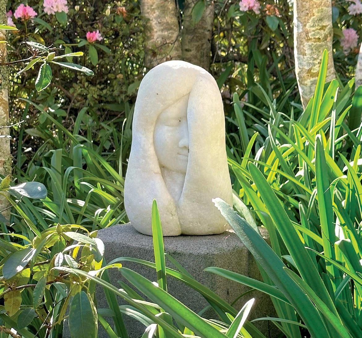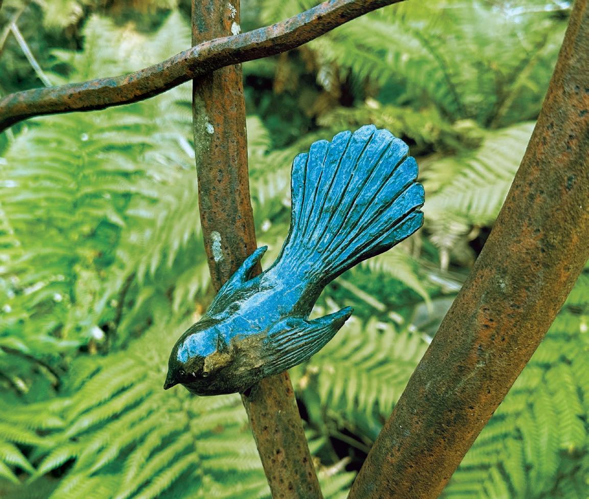 Mission accomplished. Their delightful wooden home is snuggled down in the midst of the green haven they’ve created, overlooking Waikato hills and their extensive plantings. Hugging the house are extensive natives and shrubs, as well as ponds rich with frog life, fountains, and a mesmerising array of sculptures and garden art.