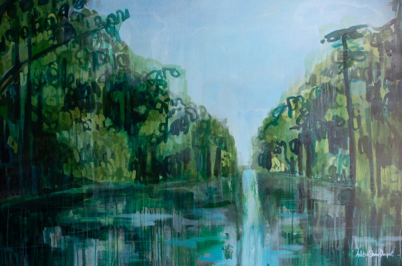 Through layered brushwork, softened edges, and a palette of dense greens and cool blues, I’ve tried to capture not just the landscape, but the feeling of it: the sensation of drifting through winding waterways, the relief of jumping into warm, welcoming water, and the rhythmic hum of nature all around. These are painted memories of sun-drenched skin, the wind stirred by a passing boat, and the calming repetition of quiet days in motion.