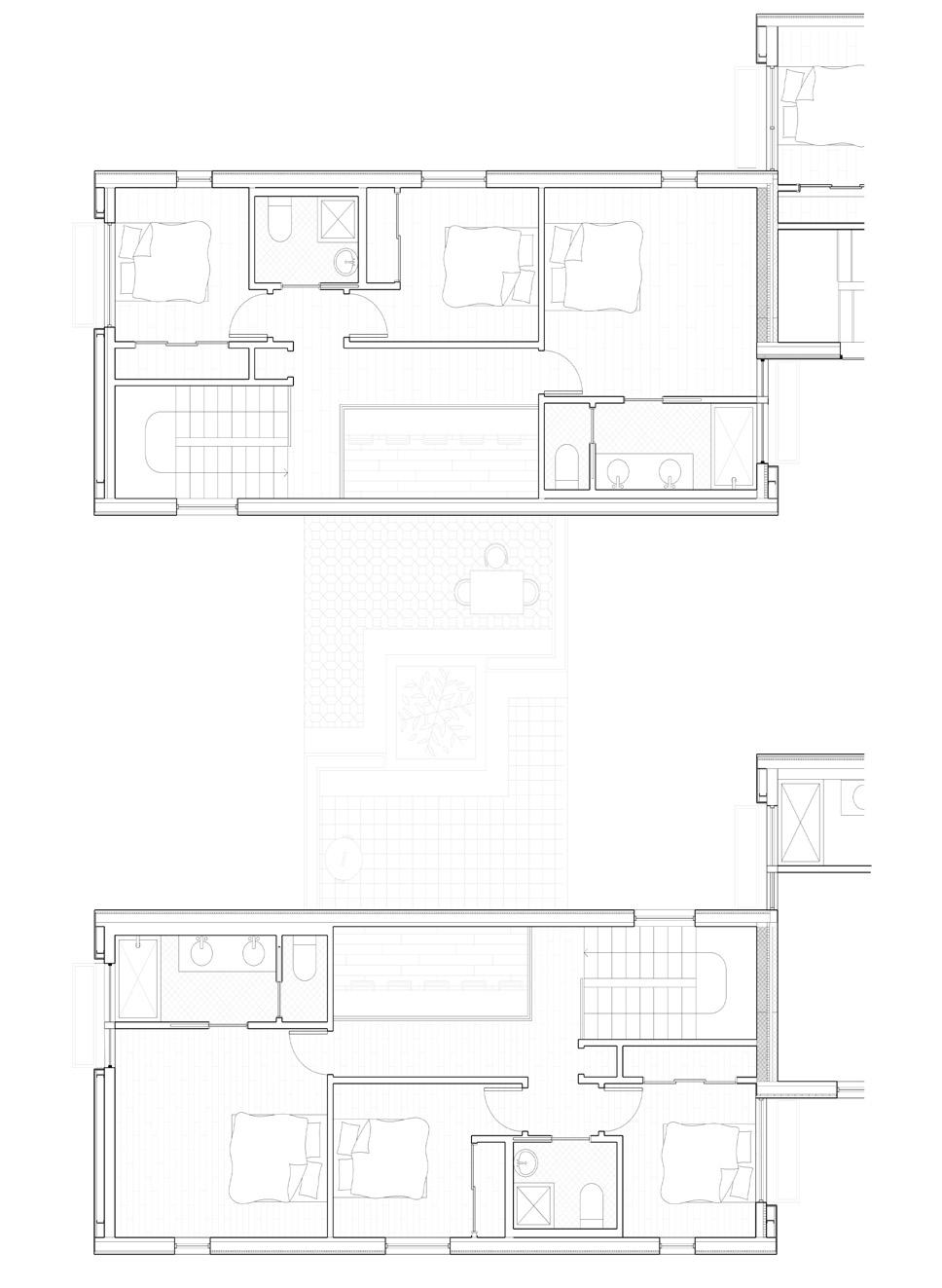 first level. The first floor is a bastion of safety and private equity, which frees up the second floor to obscure the established idea of property within the units. Variety and flexibility of inhabitation is formed through this 90 degree rotation of unit direction, allowing density to expand in multiple directions and defying the unidirectional quality of a typical row house.