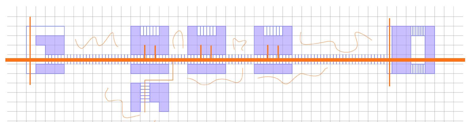 The site lies at a converging point between two urban systems: that of regular, economized, orthographic overlay, and geographic, infrastructural systems. This convergence produces a network of fragmented islands, each encompassing their own organizational DNA and representing their own ideal city and allowing us to invent and bring our own organizational system to the site: a grid overlay of shear walls run perpendicular to each other becomes both a method of structural organization and an interwoven fabric that creates experiential nuance not found in the typical row-house typology.