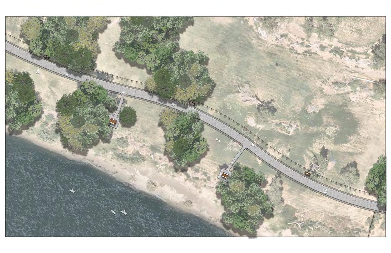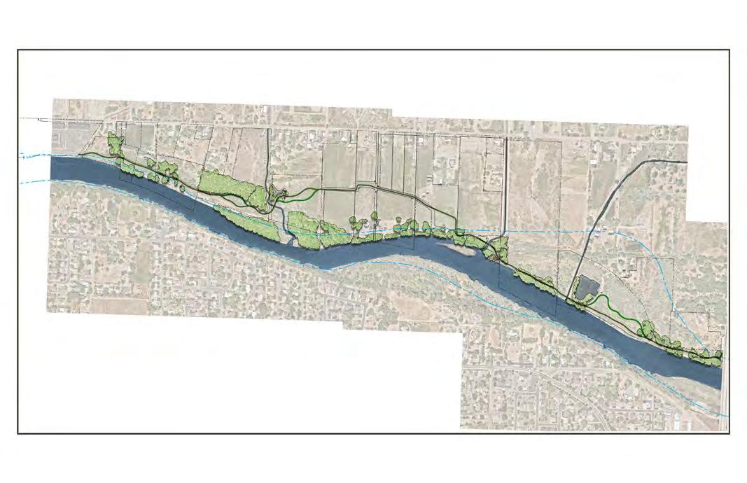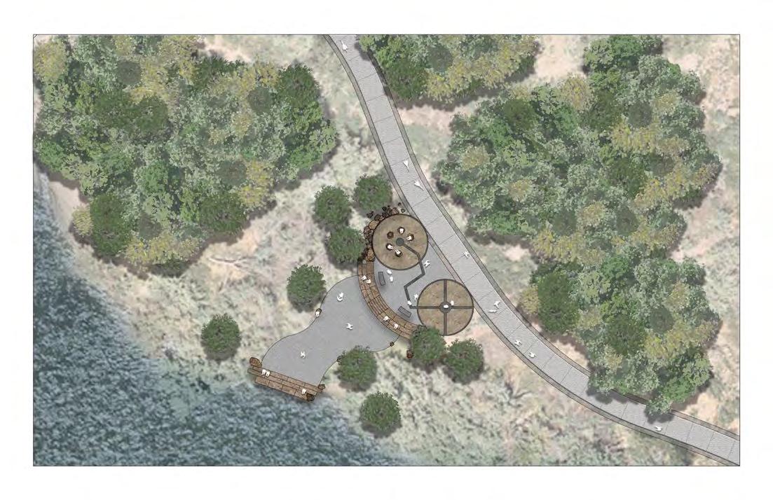 A PLAZA IS PROPOSED WITH INTERPRETIVE SIGNAGE, ELABORATING ON THE HISTORY OF THE OLD SPANISH TRAIL AND THE CROSSING OF THE GRAND. THIS IS PLACED APPROXIMATELY AT THE CROSSING POINT. THE TWO CIRCULAR PAVED AREAS SYMBOLIZE BOTH THE INDIGENOUS PEOPLE AND THE SETTLERS, CONNECTED BY A JAGGED TRAIL.