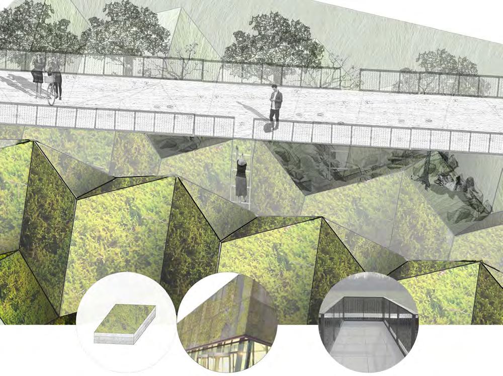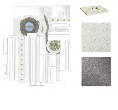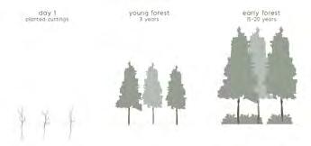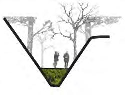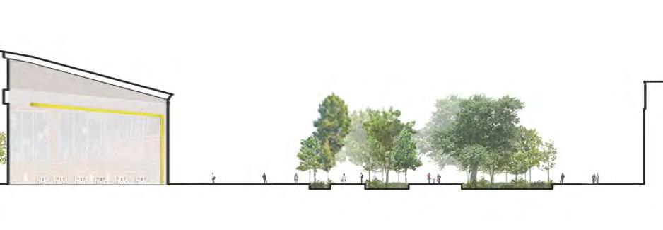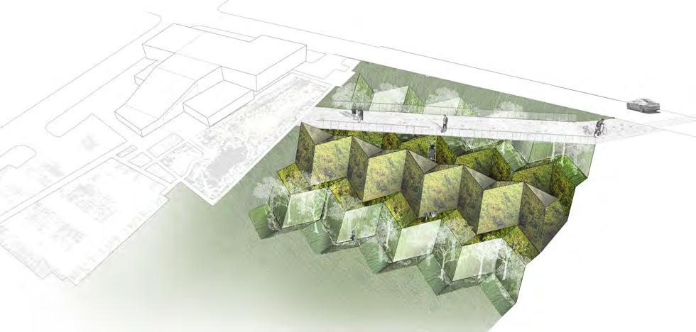 THIS DESIGN SEEKS TO ECHO ELMENTS THAT ARE REMENISCENT OF THE SITE’S PREVIOUS USES. ADJACENTLY, A MIYAWAKI FOREST JUMPSTARTS SOME MUCH NEEDED BIOREMEDIATION. THE TWO CIRCLES REPRESENT THE TWO AUDIENCES FOR WHICH THE DESIGN PERFORMS : PEOPLE + ECOSYSTEM