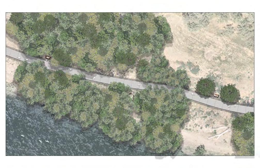 A 10 FOOT WIDE CONCRETE PATH PROVIDES AMPLES SPACE FOR BOTH PEDEDESTRIANS AND BICYCLISTS