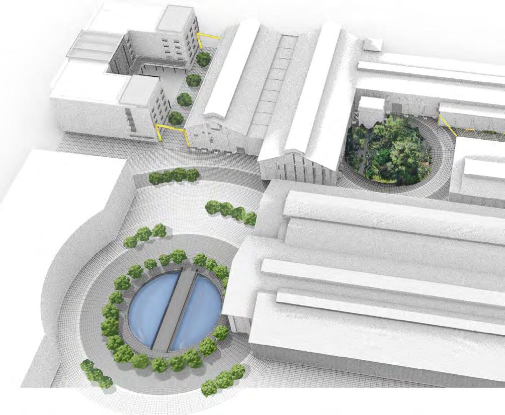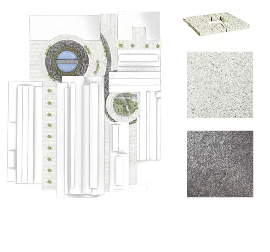 TEXTURE AND COLOR CHANGES ACCENTUATE AESTHETIC PAVED RINGS THAT ORBIT ABOUT THE TURNTABLE FOUNTAIN AND THE MIYAWAKI FOREST. THESE RINGS SERVE AS GUIDES THAT LEAD VISITORS TO THE TWO MIRRORED ATTRACTIONS FROM THROUGHT THE ENTIRE SITE.