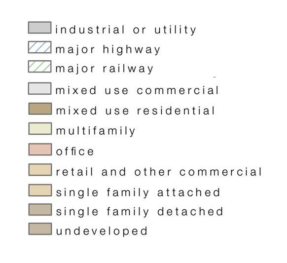 UPON FURTHER INVESTIGATION INTO LAND USE TYPES, PROMENANT USES WERE NOTED. LAND TYPE, WITHIN SET SITE BOUNDARIES, CONSISTED OF MOSTLY INDUSTRIAL AND UTILITY, AS WELL AS MIXED RESIDENTIAL, OFFICE, AND COMMERICAL.