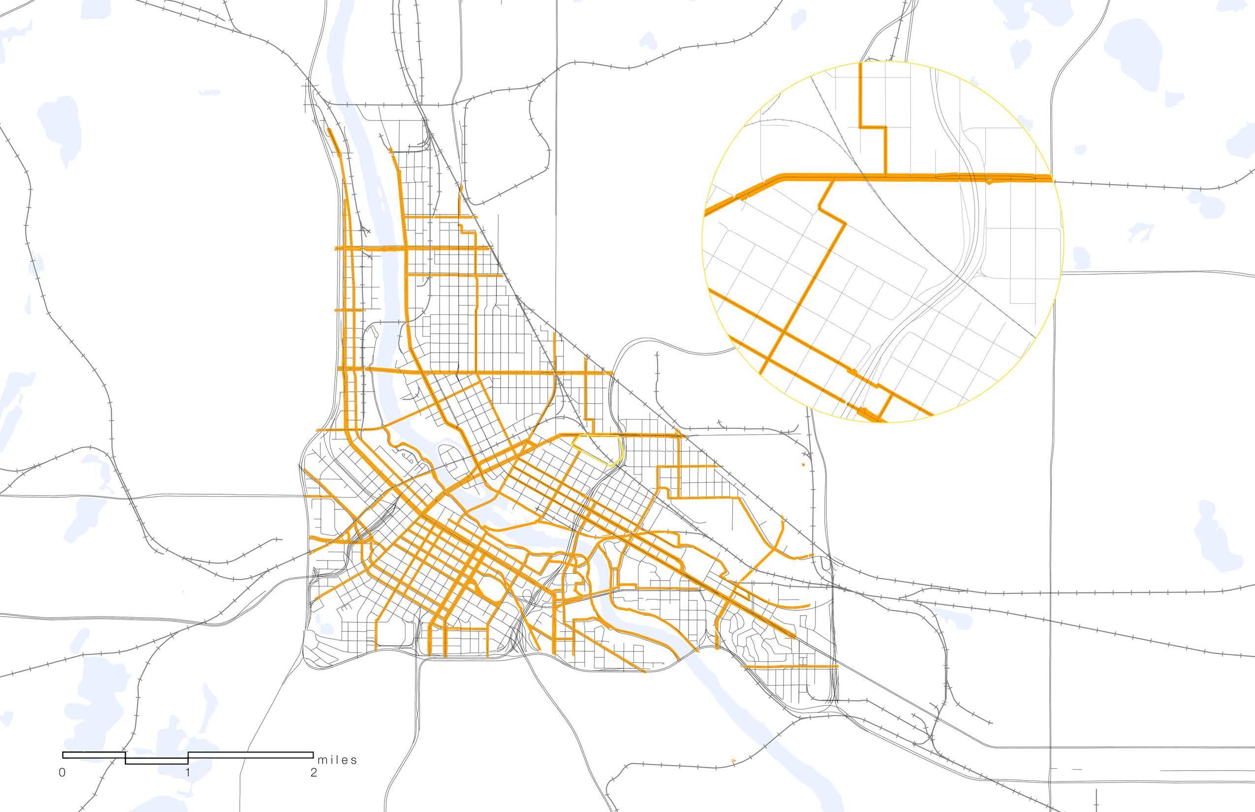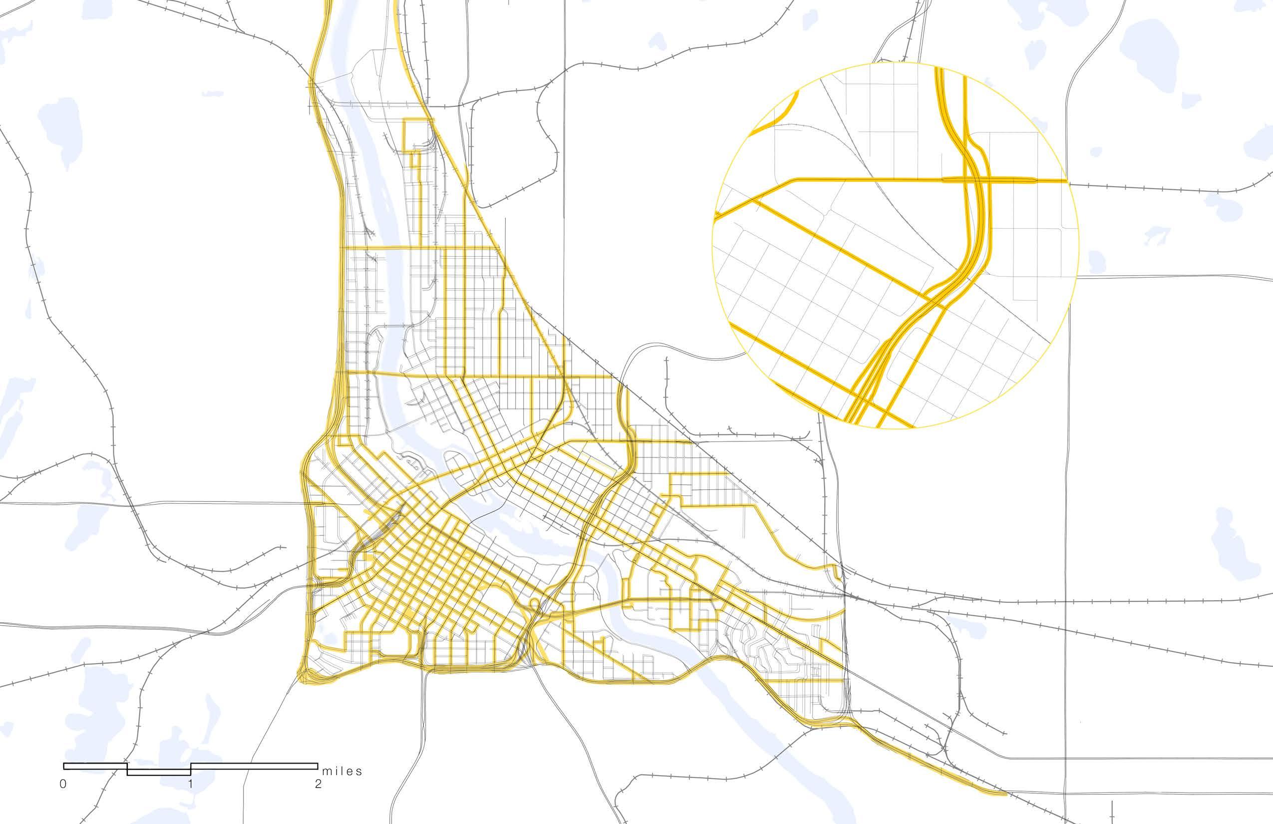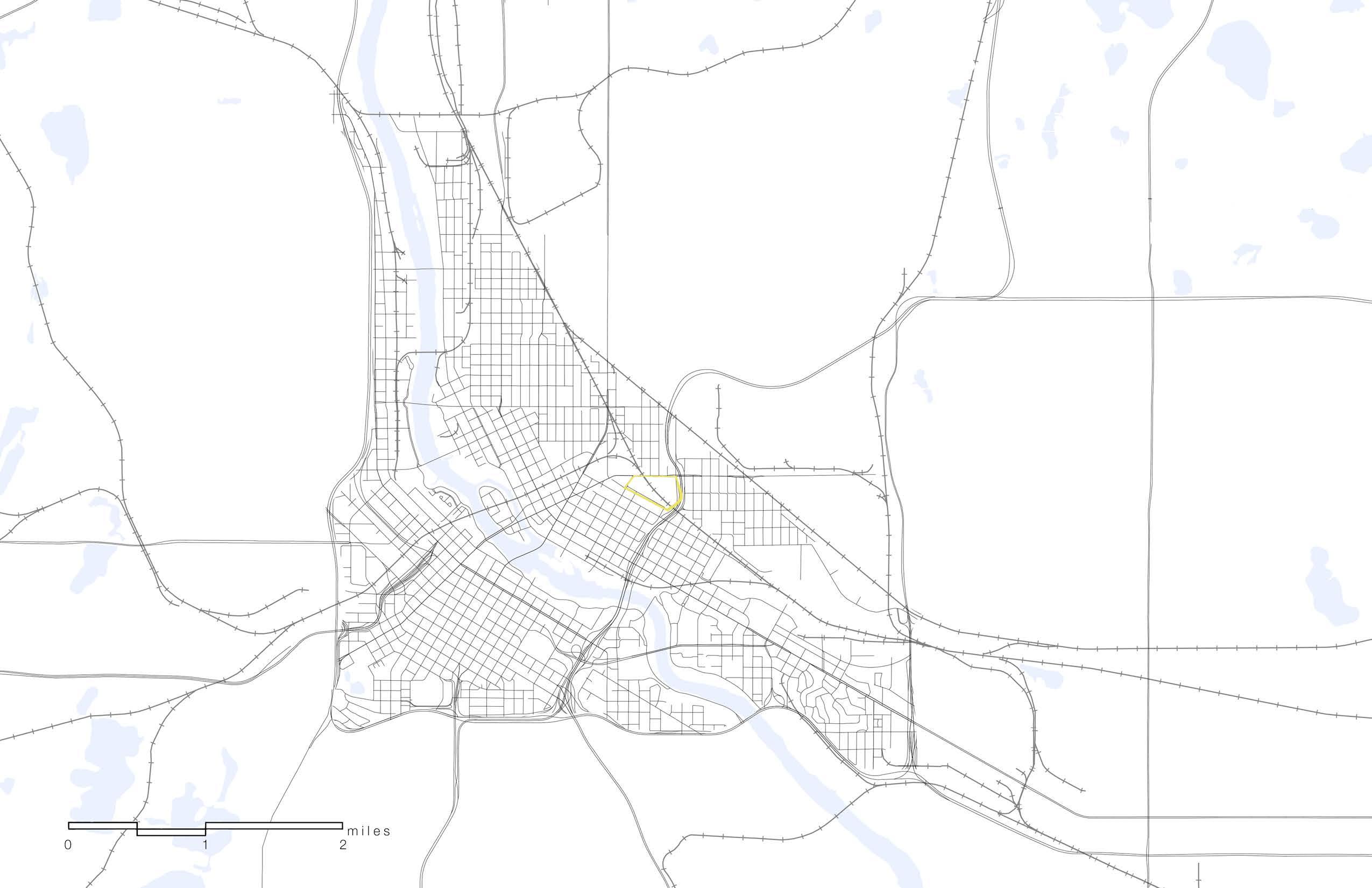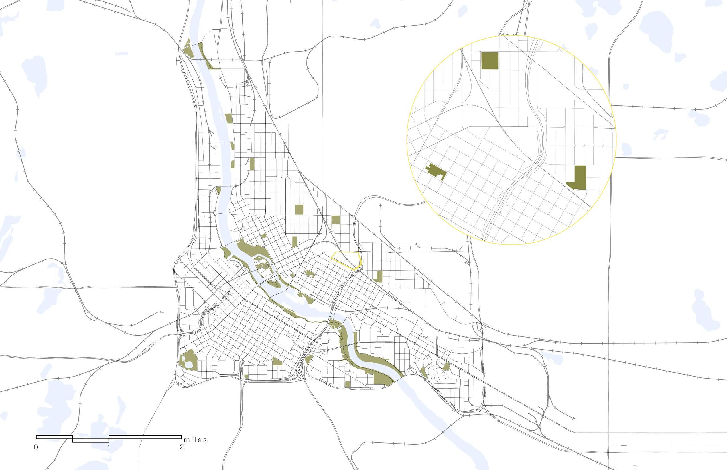 USING ARCGIS I CREATED A CONTEXT MAP SHOWING HOLMES PARK, IN MINNEAPOLIS, MN, AND IT’S PROXIMITY TO THE GRAND ROUNDS PARKWAY. THE CLOSEST PARK TO THE HIGHLIGHTED SITE IS FATHER HENNEPIN BLUFF PARK, ONLY .25 MILES AWAY. WITHIN 5 MILES FROM THE SITE, ONE CAN TRAVEL TO MOST OF THE PARKWAY. 2 AND 5 MILES ARE RELATIVELY WALKABLE, MAKING HOLMES PARK A MAGNET LOCATION FOR BIKERS AND PEDESTRIANS TRAVELING ALONG THE PARKWAY.