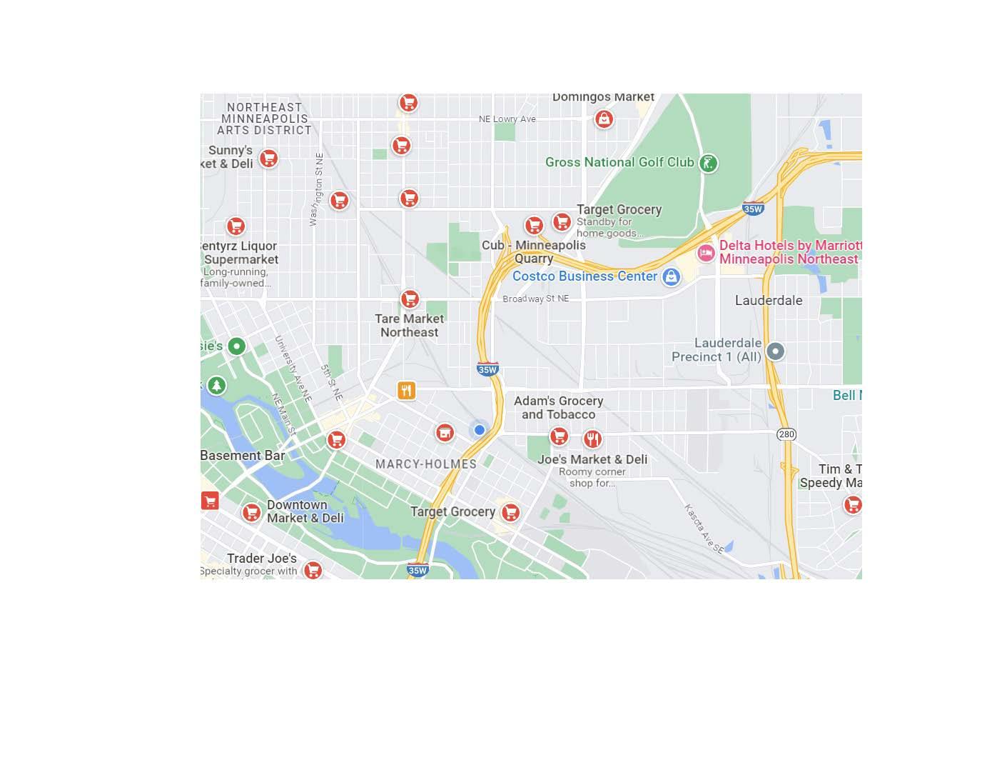 SURVEY RESPONDERS SHARED THEY WANT A CLOSE AND WALKABLE GROCERY STORE. ONLY TWO STORES EXIST WITHIN A 20 MINUTE WALKING DISTANCE SERVE FRESH PRODUCE. CONSIDERING THE WALK HOME, GROCERY TRIPS COULD AMOUNT TO AT LEAST 40 MINUTES, TOTAL.