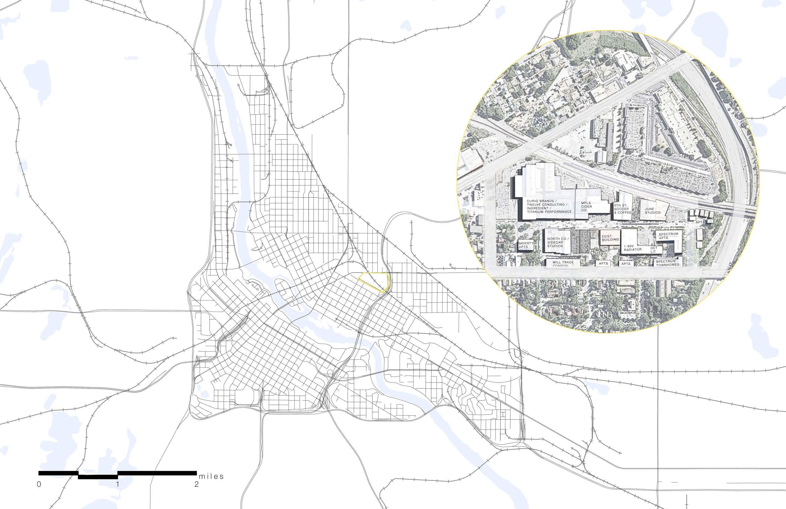THIS SITE EXISTS NESTLED BETWEEN E. HENNEPIN, HIGHWAY 35 W AND SE 8TH ST, ENCAPSULATING AN OLD POST-INDUSTRIAL NEIGHBORHOOD, POISED FOR REINVENTION.
