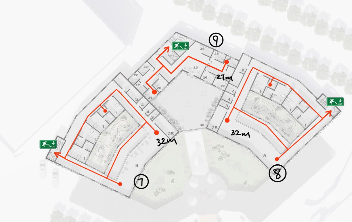 According to my draft plan, the longest escape route is 33 meters which meets the requirement. However, there are a few bedrooms that have 32 meters route which would fail to meet the requirement. In my future design, I will adjust the location of the bedroom to the north side of the building so the route could be less than 18 meters.