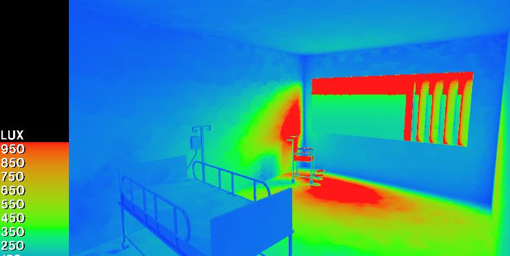 To avoid the generation of shadow and cause misinterpretation, the design of the patients’ ward is applied with solar shading fins to reduce the direct sunlight. However, by using ISE to simulate luminance levels in the wards, the shading failed to achieve satisfied uniformity during the summer (top right). This was improved by creating adjustable shading timber fins to cover the whole window responding to different seasons (see detail plan).