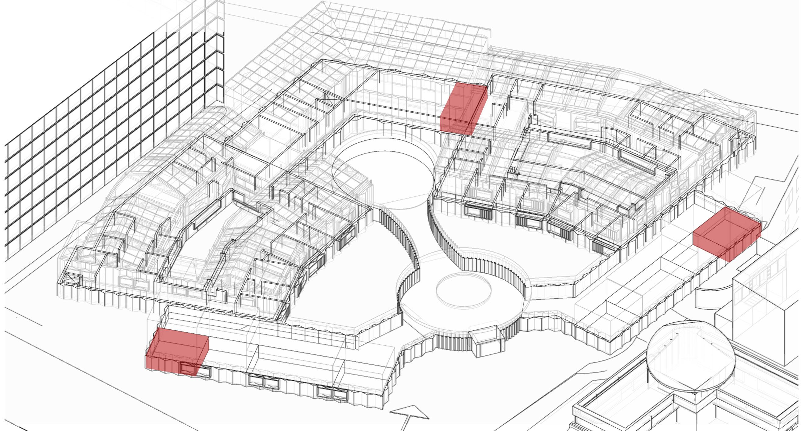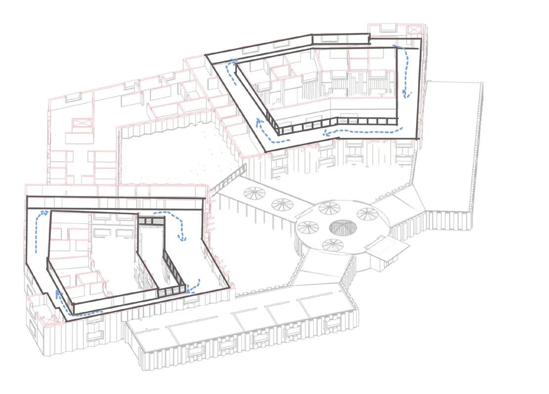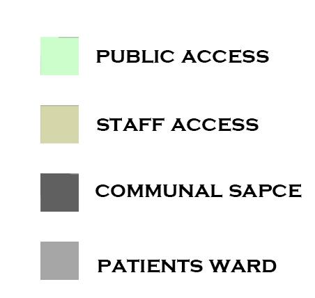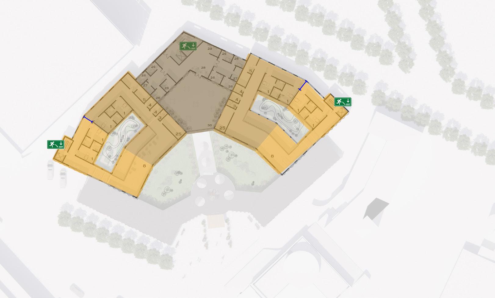 The design includes various mandatory functional spaces required in this project. In a dementia care home, the building should be separated by male and female wards, including an interior and an exterior wondering path for the patient safety. The wandering path should be a closed-loop and without any dead end to avoid agitation behavior cost by losing direction. The wards should also include an assistant bathroom and accessible toilets. The building should control the circulation and divide space into 3 types: