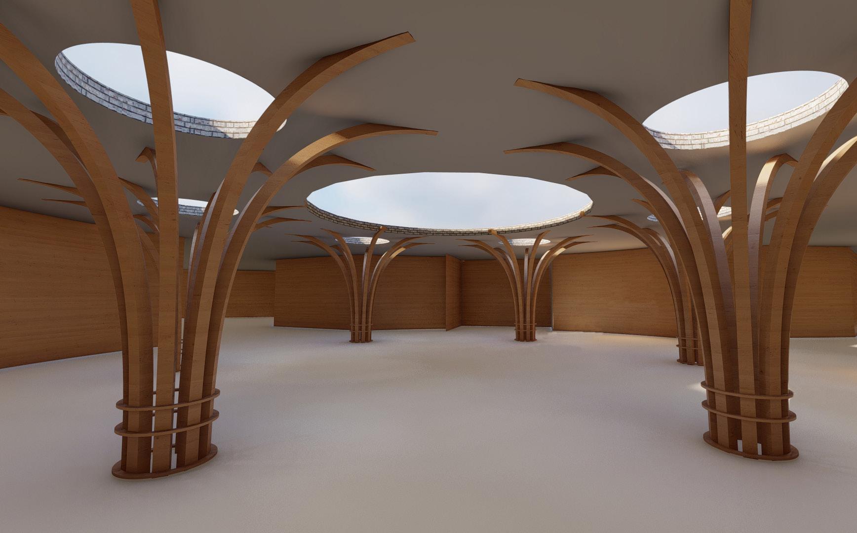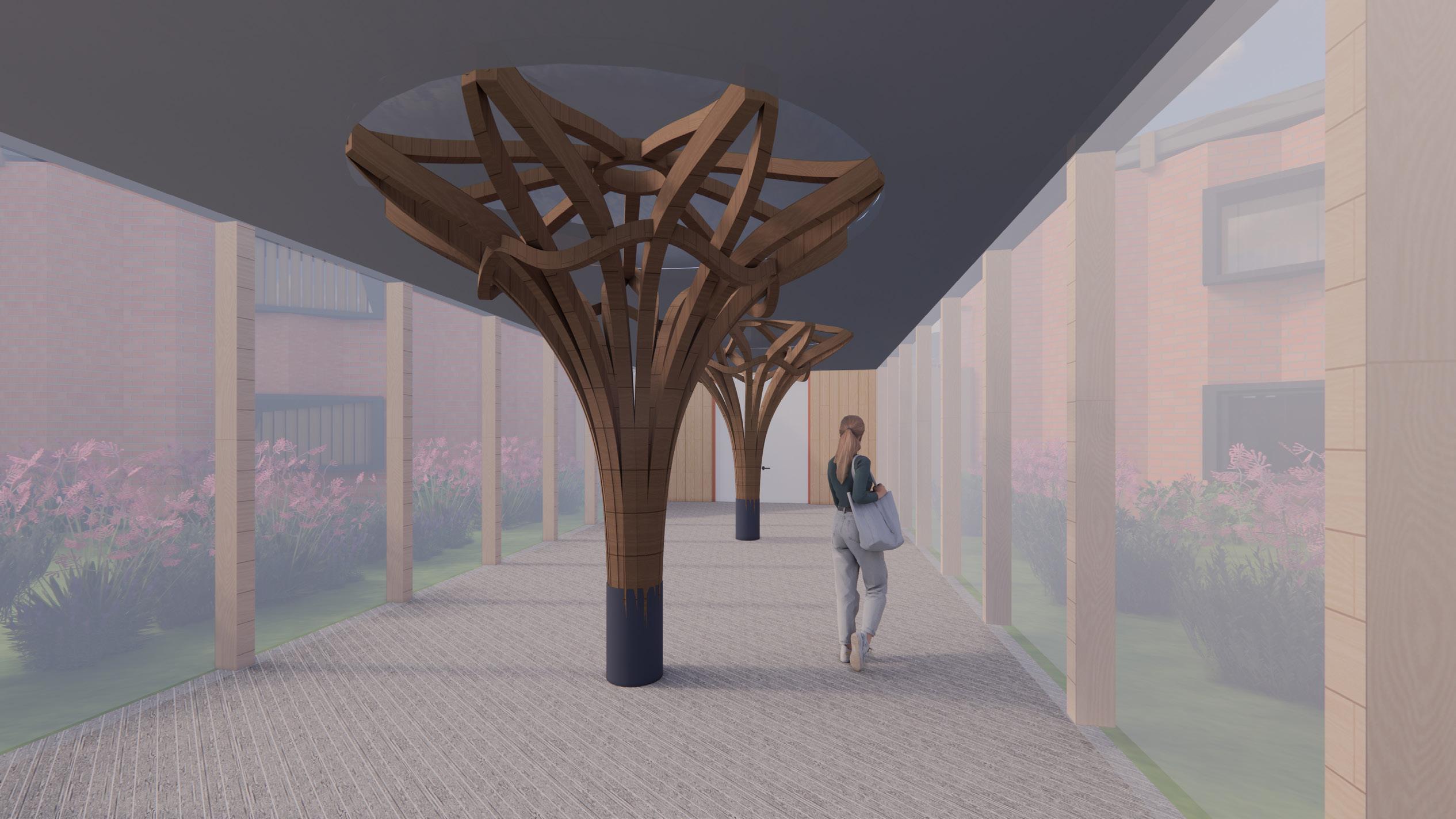 By extending the architectural language from Think Through Making, I applied the timber column language in my reception space. The shape of the column imitates the form of a tree, hence it would avoid the space from feeling cold and institution. At the top of the column, the skylight would be applied with frosted glass, which would not generate shadow on the floor.